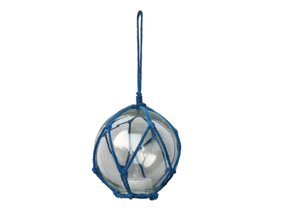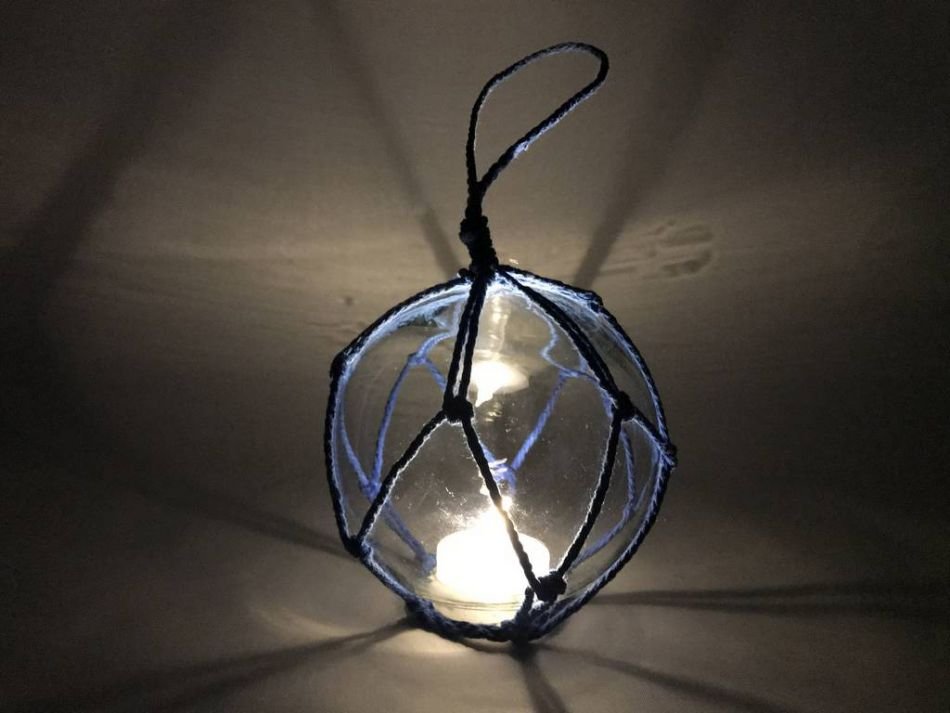 This “LED Lighted Clear Japanese Glass Ball Fishing Float with Blue Netting Decoration 4”" is a perfect beach wall art decoration. Gorgeous whether in your home or office, indoor or out, enjoy the charming inner warmth of this glass float as the flameless LED tea light inside plays throughout the clear glass ball.  Perfectly contrasting the glass float is the authentic fishing rope netting which holds the float in place. Mesmerizing and enchanting, enjoy the historic wonder and brilliant style of this LED lighted nautical glass float each and every day.