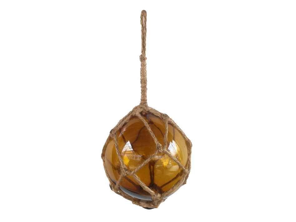 This Amber Japanese Glass Ball Fishing Float Decoration Christmas Ornament  4" is a perfect piece of beach wall art. Gorgeous decor on your Christmas tree, enjoy the charming inner warmth of this buoy float as lights play through the glass ball. Perfectly contrasting the glass float is the authentic fishing rope netting which holds the float in place.  This float ornament decoration will light up any tree and adds the final nautical touch your Christmas needs. This charming float ornament can be easily hung onto any Christmas Tree.