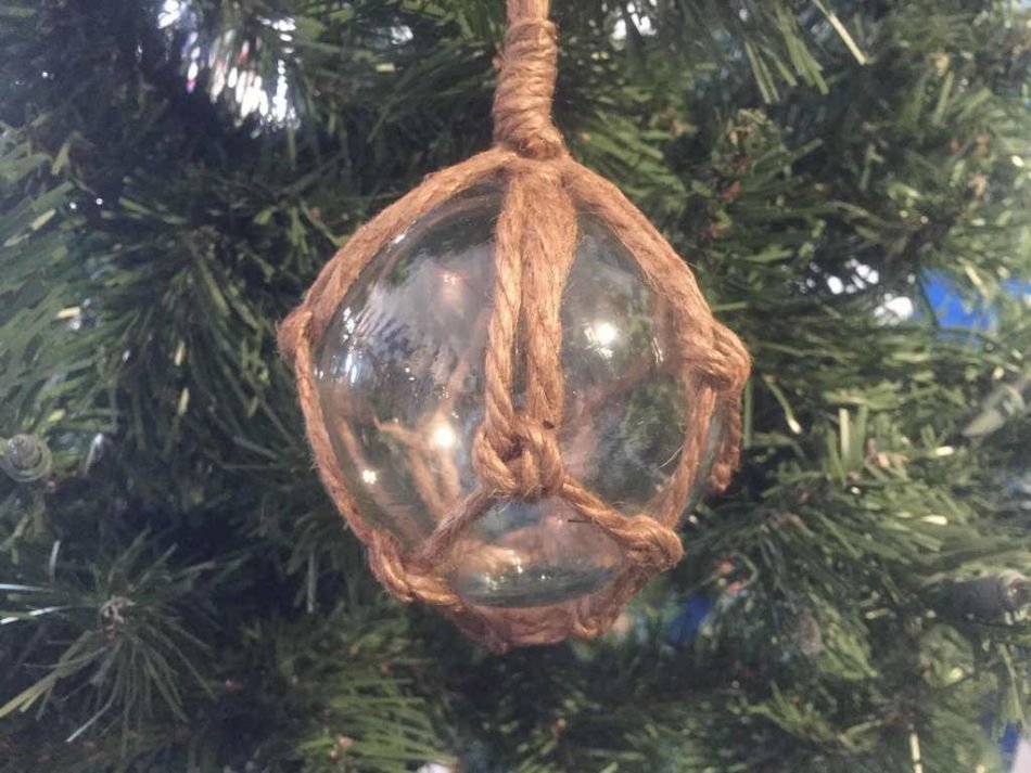 This Clear Japanese Glass Ball Fishing Float Decoration Christmas Ornament  3" is a perfect piece of beach wall art. Gorgeous decor on your Christmas tree, enjoy the charming inner warmth of this buoy float as lights play through the glass ball. Perfectly contrasting the glass float is the authentic fishing rope netting which holds the float in place.  This float ornament decoration will light up any tree and adds the final nautical touch your Christmas needs. This charming float ornament can be easily hung onto any Christmas Tree.