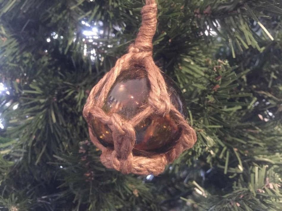 This Amber Japanese Glass Ball Fishing Float Decoration Christmas Ornament  2" is a perfect piece of beach wall art. Gorgeous decor on your Christmas tree, enjoy the charming inner warmth of this buoy float as lights play through the glass ball. Perfectly contrasting the glass float is the authentic fishing rope netting which holds the float in place.  This float ornament decoration will light up any tree and adds the final nautical touch your Christmas needs. This charming float ornament can be easily hung onto any Christmas Tree.