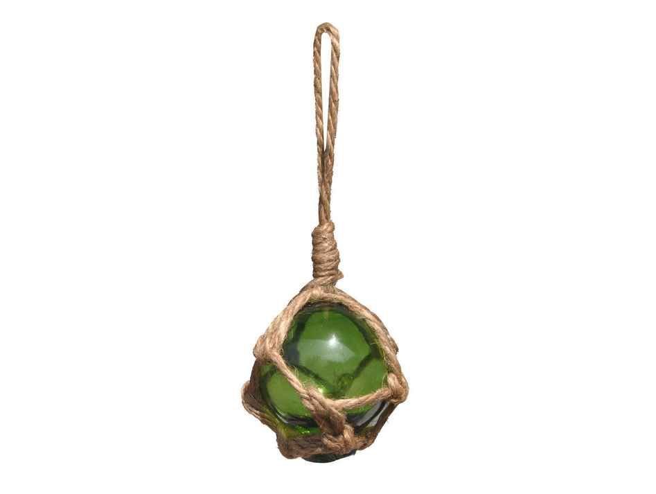 This Green Japanese Glass Ball Fishing Float Decoration Christmas Ornament  2" is a perfect piece of beach wall art. Gorgeous decor on your Christmas tree, enjoy the charming inner warmth of this buoy float as lights play through the glass ball. Perfectly contrasting the glass float is the authentic fishing rope netting which holds the float in place.  This float ornament decoration will light up any tree and adds the final nautical touch your Christmas needs. This charming float ornament can be easily hung onto any Christmas Tree.