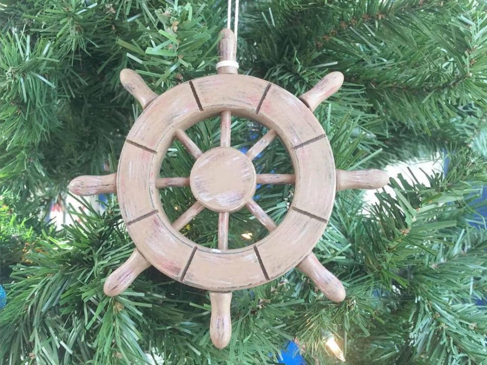 This Rustic Wood Decorative Ship Wheel Christmas Tree Ornament 6" is perfectly combined with the warmth of the holiday season and the nautical lifestyle.  This ship wheel ornament decoration will light up any tree and adds the final nautical touch your Christmas needs. This charming boats steering wheel ornament has eight spokes and can be easily hung onto any Christmas Tree.