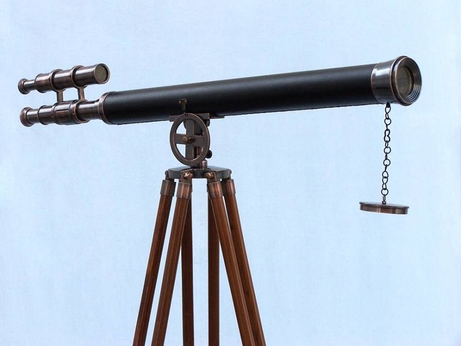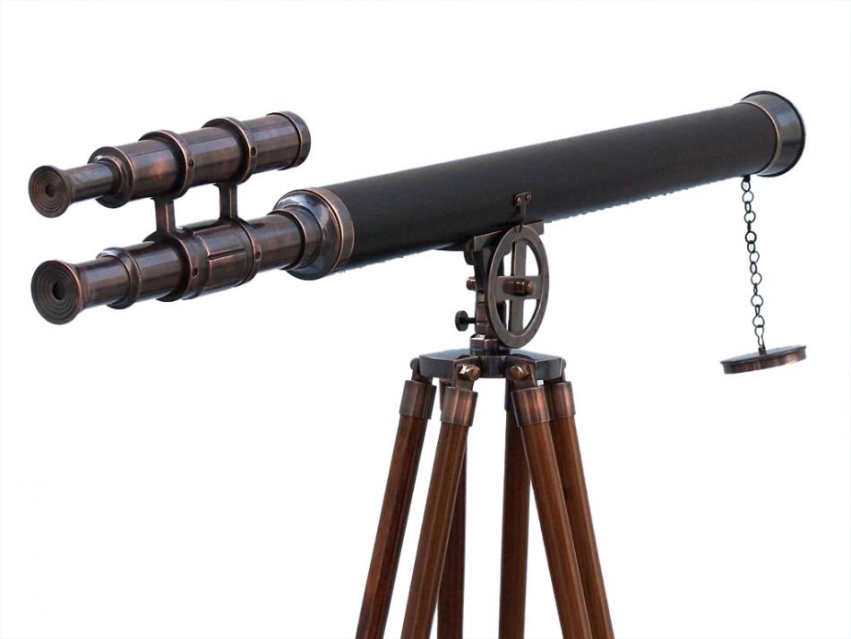 The Floor Standing Antique Copper Griffith Astro Telescope 65" with view finder is the pinnacle of our wide telescope selection. This beautiful antique copper finish telescope is wrapped in leather and mounted on a tripod. The objective lens is 42mm. This telescope is a beautifully functioning nautical masterpiece, with a 42mm objective lens that produces up to 15x magnification. Focusing is accomplished by adjusting the eyepiece ring on the telescope tube. This antique copper nautical gem adds a shine to any room it enters. A removable antique copper finish cap, connected by a chain, protects the objective lens.