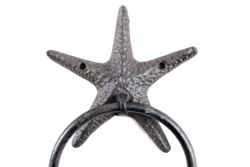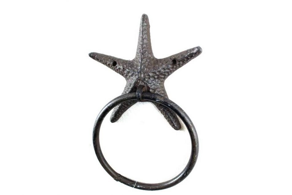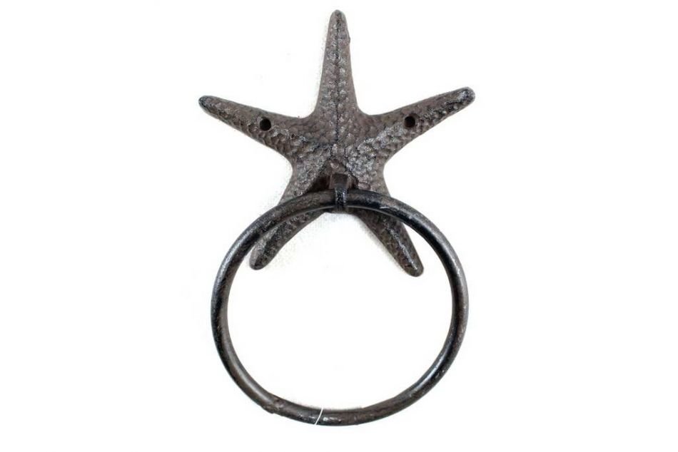 This Cast Iron Starfish Towel Holder 8.5" is perfect for any nautical inspired bathroom or kitchen. It adds charm to any nautical room, while impressing your guests with their substance and thoughtfulness. Ideal for hanging towels, this durable towel holder 8.5" is crafted from cast iron. Easily mountable, display this decorative holder to show those who visit your home the affinity for the sea-faring lifestyle.
