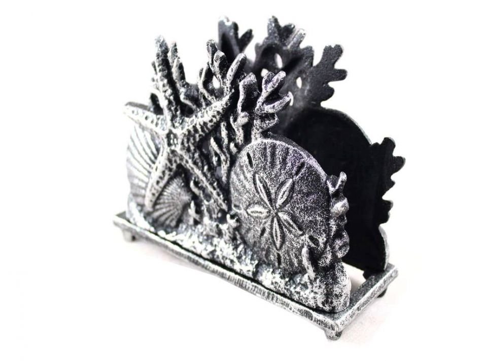 This Antique Silver Cast Iron Seashell Napkin Holder 7" is perfect for any nautical inspired kitchen or dining room. It adds charm to any nautical room, while impressing your guests with their substance and thoughtfulness. Ideal for napkins, this durable napkin holder is crafted from cast iron. Easily mountable, display this decorative holder to show those who visit your home the affinity for the sea-faring lifestyle.