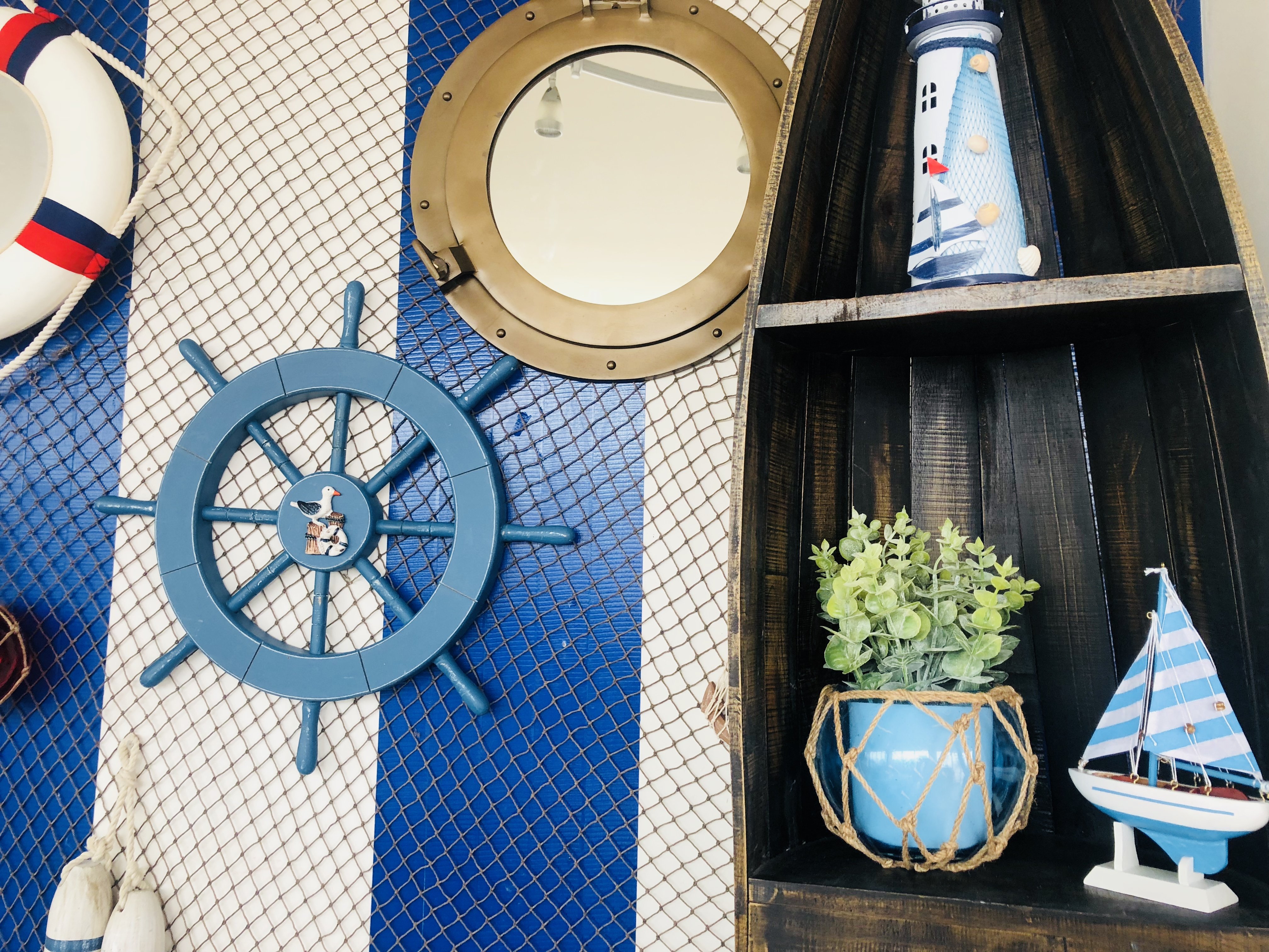 • Eight rustic light blue spokes surround ship wheel
