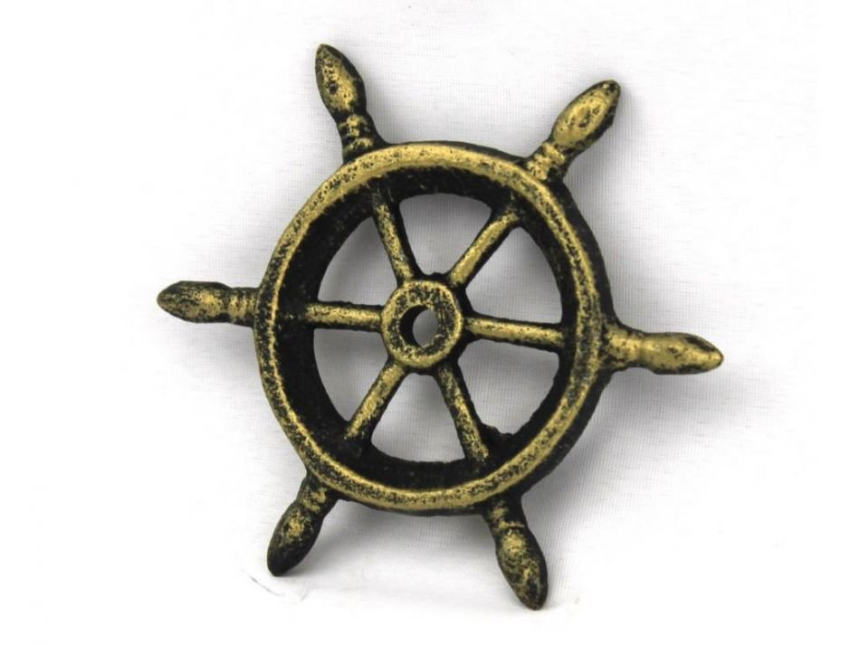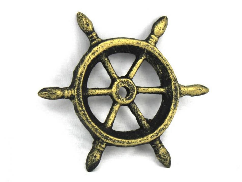Handcrafted from gleaming Antique Gold Cast Iron, this fabulous Ship Wheel Paperweight 4" is the perfect addition to any desk - whether at home or in the office. As a talisman to sailors present and past  the ship's wheel was a sign of good fortune. Stylishly recreated here, make use of this beautiful weight and make a true nautical statement.