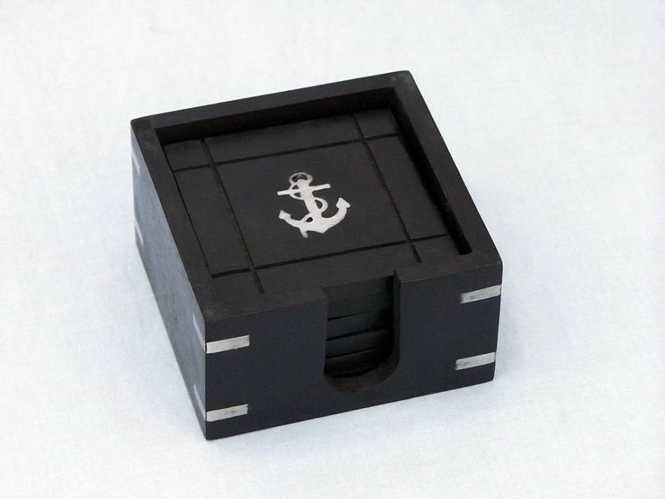 Wooden Black Coasters with Chrome Anchor Inlay 4"" - Set of 6 Wooden Black Coasters with Chrome Anchor Inlay 4"" - Set of 6 Wooden Black Coasters with Chrome Anchor Inlay 4"" - Set of 6