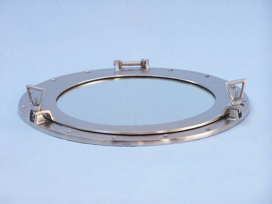 This Brushed Nickel Deluxe Class Porthole Mirror 17" adds sophistication, style, and charm for those looking to enhance rooms with a nautical theme. This porthole mirror has a sturdy, heavy and authentic appearance, and is made of brushed nickel and glass which can easily be hung to grace any nautical theme wall. This all brushed nickel porthole mirror makes a fabulous style statement in any room with its classic round frame, metal-like rivets and two dog ears.