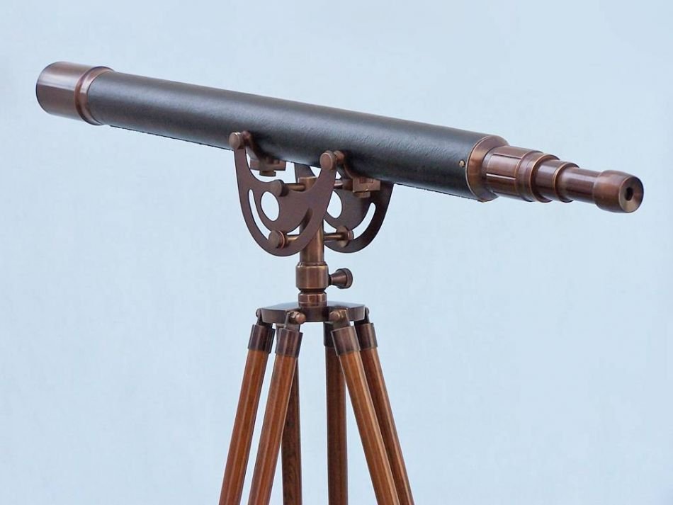 The Floor Standing Antique Copper/Leather Anchormaster Telescope 65" is a beautiful, antique copper and leather, refractor telescope mounted on a wooden tripod. This leather telescope is a fully functioning nautical masterpiece that adds class and sophistication to any room it’s in. This is a perfect nautical gift for the explorer in your life. The main scope is antique copper wrapped in leather, which shines beautifully when placed in the sunlight. Focusing is accomplished by adjusting the eyepiece ring on the telescope tube, with up to 18x magnification.