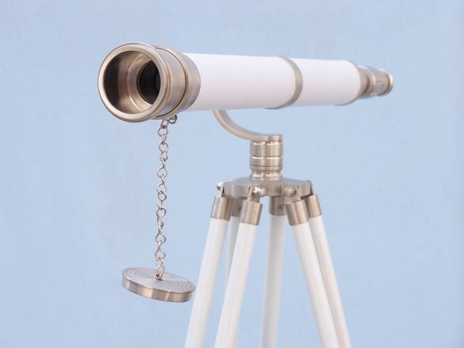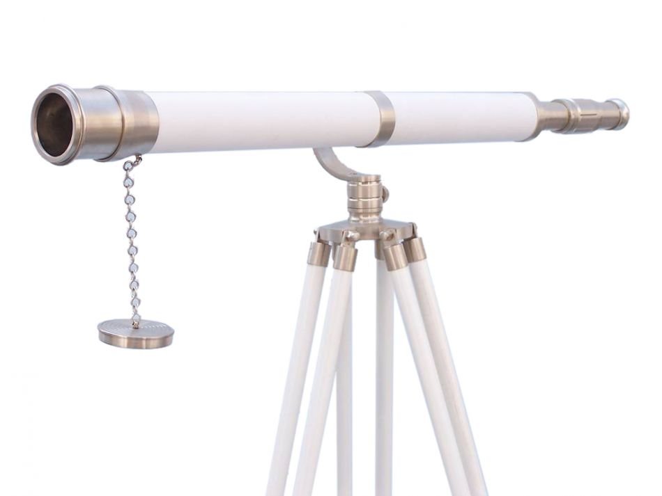 The Hampton Nautical Brushed Nickel/ White Leather Galileo Telescope 65" is by far our standout choice amongst nautical enthusiasts worldwide. Constructed from brushed nickel and leather, this refractor telescope is mounted on a white wooden tripod. This telescope is a fully functioning nautical masterpiece that adds class and sophistication to any room it’s in. This is a perfect gift for the nautical explorer, an appropriate piece to spruce up an office for the busy executive, or perfectly position this exquisite telescope by your window sill to stargaze. The main scope is brushed nickel wrapped in white leather, which shines beautifully when placed in the sunlight. Focusing is accomplished by adjusting the eyepiece ring on the telescope tube, with up to 15x magnification. A removable brushed nickel cap, connected by a chain, protects the objective lens.