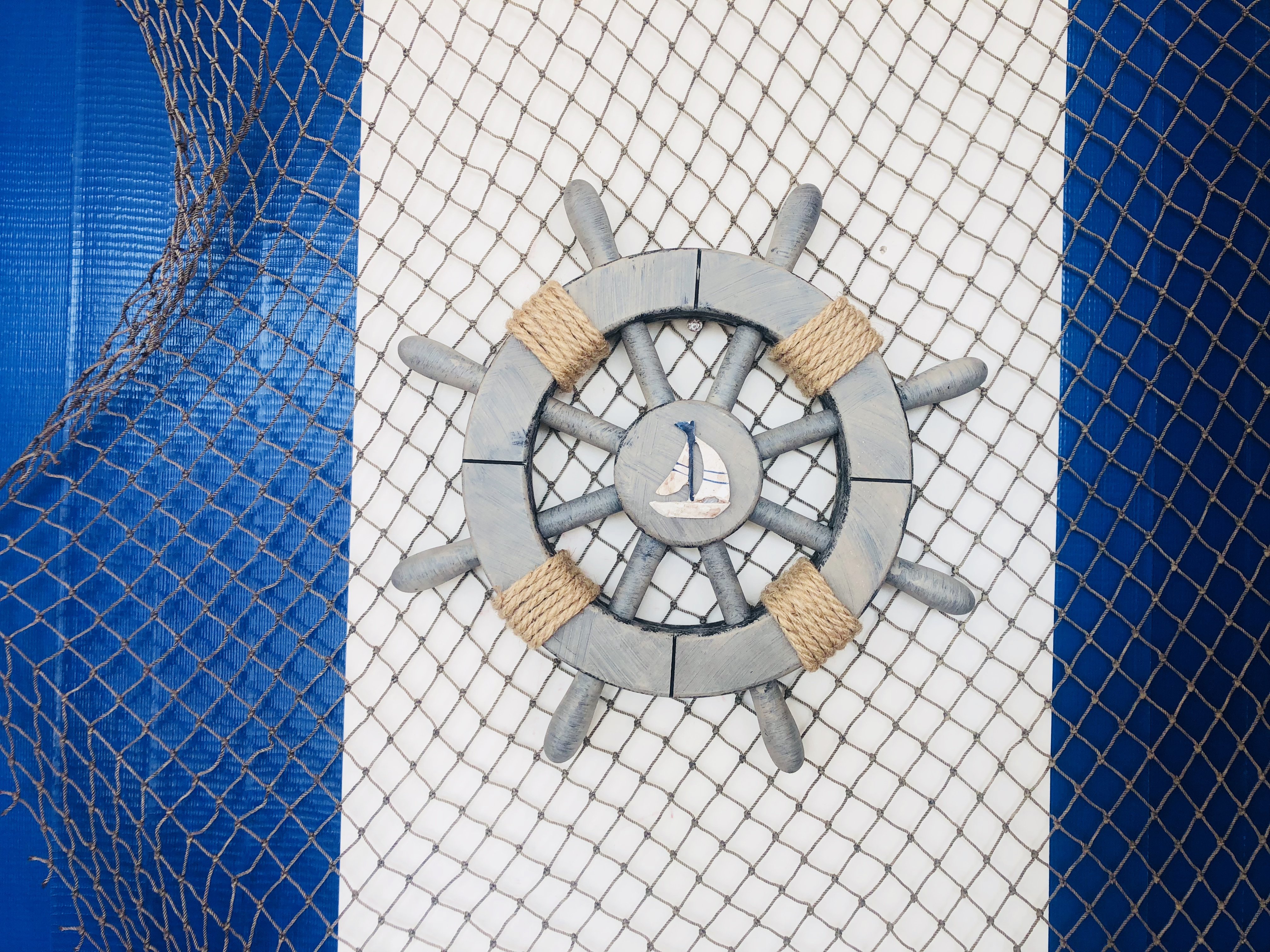 • White sailboat decoration in center of wheel accents the wooden finish perfectly