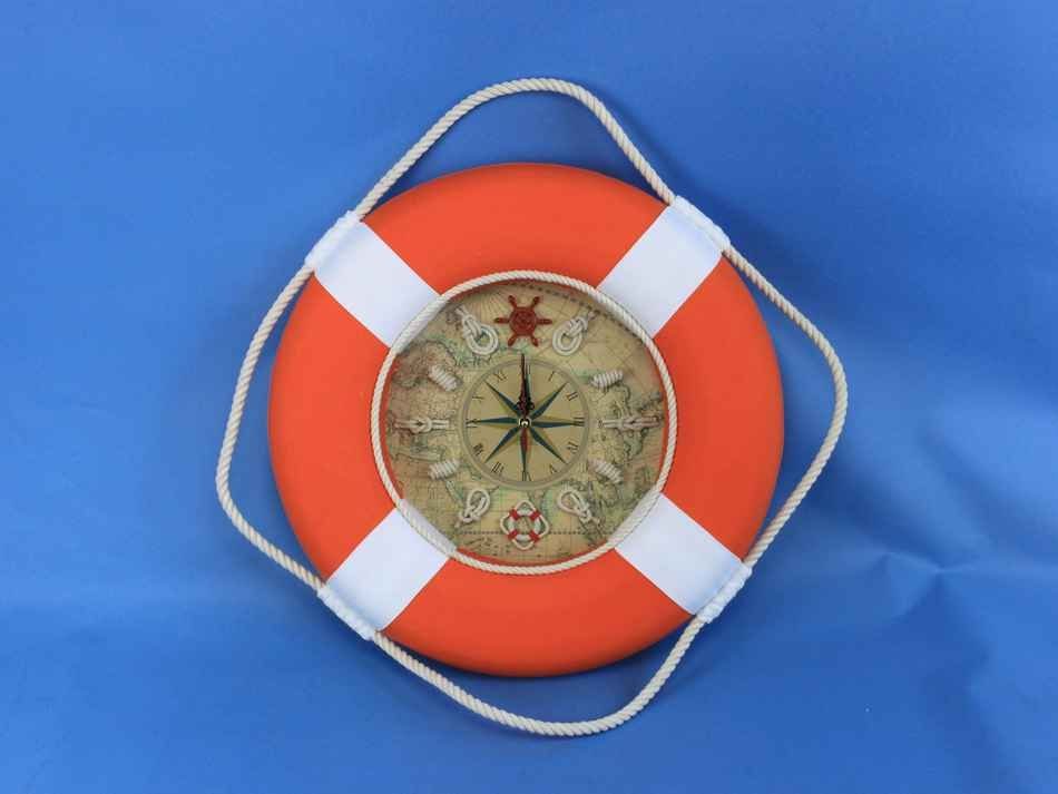 A decorative plethora of functionality and grace, the Vibrant Orange Decorative Lifering Clock With White Bands 18" is classy and functional all while creating the perfect nautical mood in your home, office, or pool house. A Nautical star is displayed in the middle of the clock with roman numeric characters at the end of each star point for an elegant touch. Sailors knots mark individual hours, and the real map background supplies a strong feel of being on a real ship.