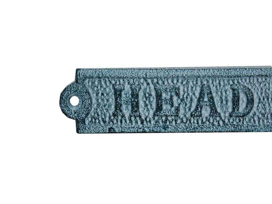 Ideal for posting on a boat, in a boathouse, or any nautical themed room, this brilliant, this Light Blue Whitewashed Cast Iron Head Sign 6" clearly gets its point across. With a textured, rustic framing and body, this distinctive sign allows for easy decorative mounting. Display this decorative piece on your boat or in your home and show your affinity for the sea-faring lifestyle to those who visit.