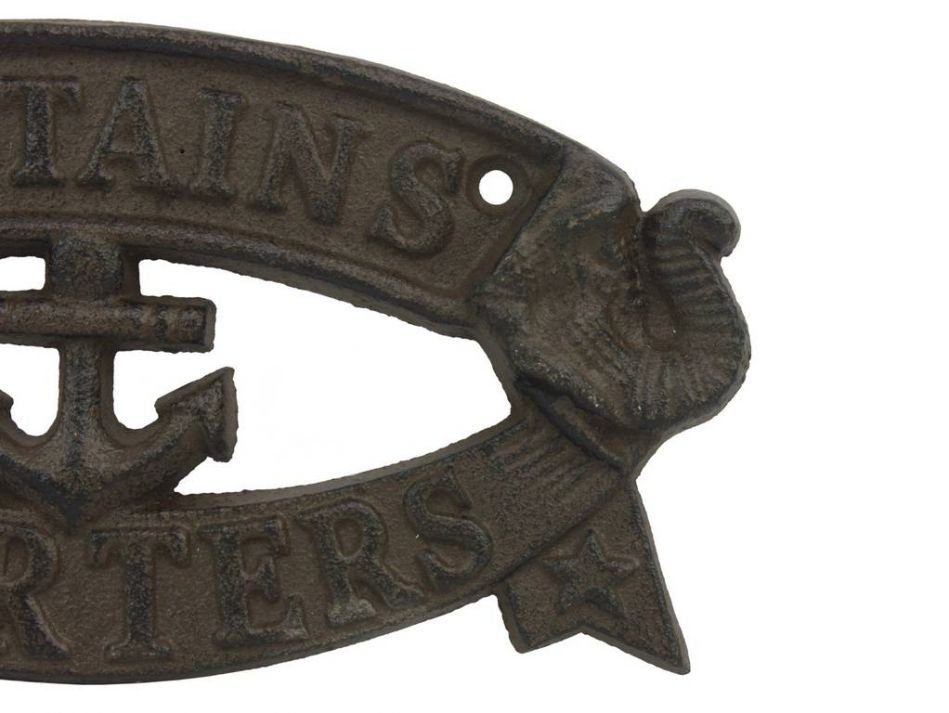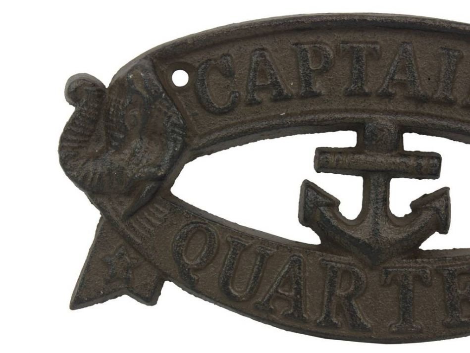 Ideal for posting on a boat, in a boathouse, or any nautical themed room, this brilliant, this Cast Iron Captain's Quarters Sign 8" clearly gets its point across. With a textured, rustic framing and body, this distinctive sign allows for easy decorative mounting. Display this decorative piece on your boat or in your home and show your affinity for the sea-faring lifestyle to those who visit.