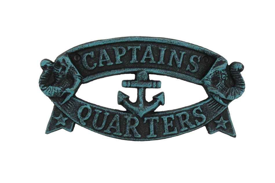Seaworn Blue Cast Iron Captains Quarters Sign 8""