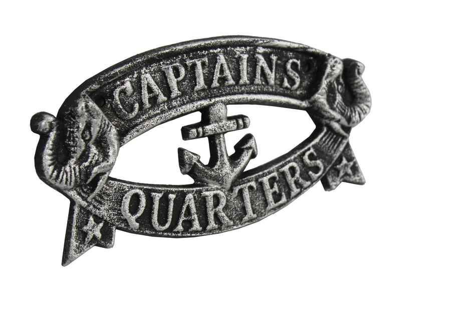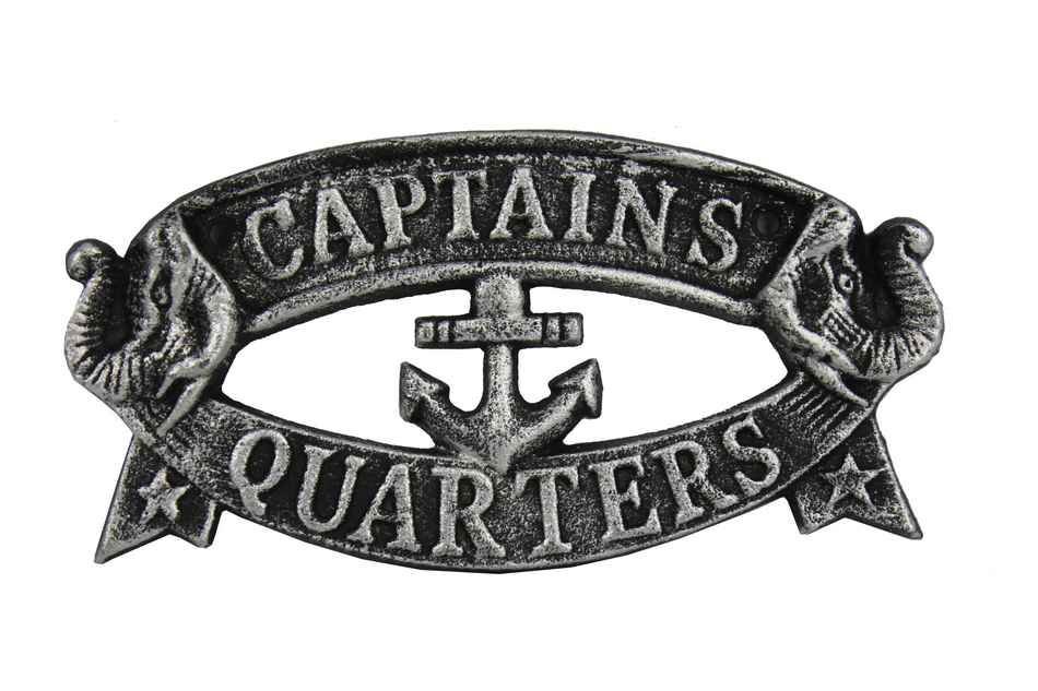 Ideal for posting on a boat, in a boathouse, or any nautical themed room, this brilliant, this Antique Silver Cast Iron Captain's Quarters Sign 8" clearly gets its point across. With a textured, rustic framing and body, this distinctive sign allows for easy decorative mounting. Display this decorative piece on your boat or in your home and show your affinity for the sea-faring lifestyle to those who visit.