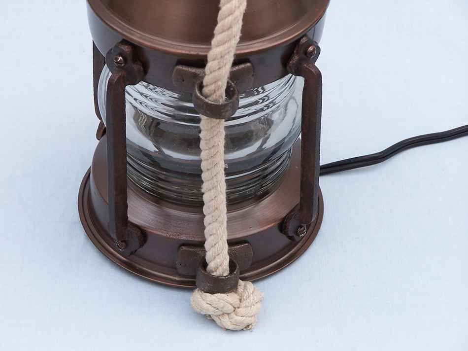 This antique copper anchor electric lantern 16" is a beautiful handcrafted production of heavy copper hardware. This lanterns provides fantastic emergency lighting or like their oil wick counterparts, these electric lanterns can provide historic and authentic nautical decor. There is a thick clear glass lens which shows an illuminated arc of 225 degrees. Each contains an interior corrugated copper reflector. The oil burning pot and wick unit that was serviced from the bottom of the lanterns has now been converted into an electric fixture. There is room inside for a full size 25w light bulb. Some the applications that our electric lanterns have been used for include, wall lanterns, outdoor lanterns, ships wheel chandeliers, exterior lighting, ceiling fixtures and end table lamps. They also make perfect patio/deck electric lamps. You can also choose to mount them on your wall or post. The back is fitted with one thick cast copper mounting bracket which is riveted to the body of the lamp for extra support. All hardware is included. They are of solid copper construction, not to be confused with the cheaper painted or plated varieties. Ideal gifts for people who love nautical lamp memorabilia.