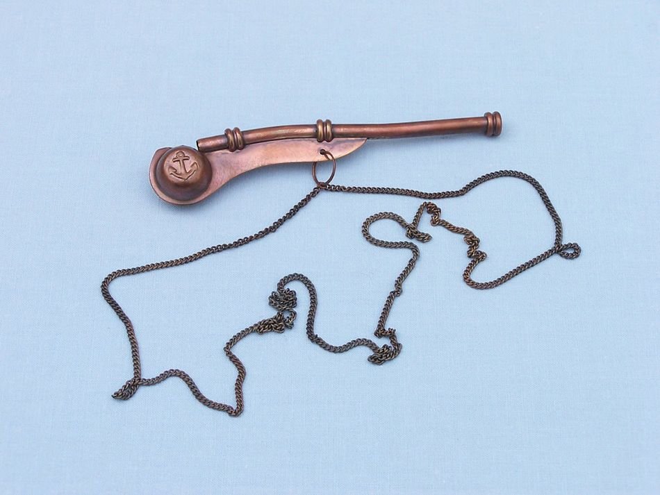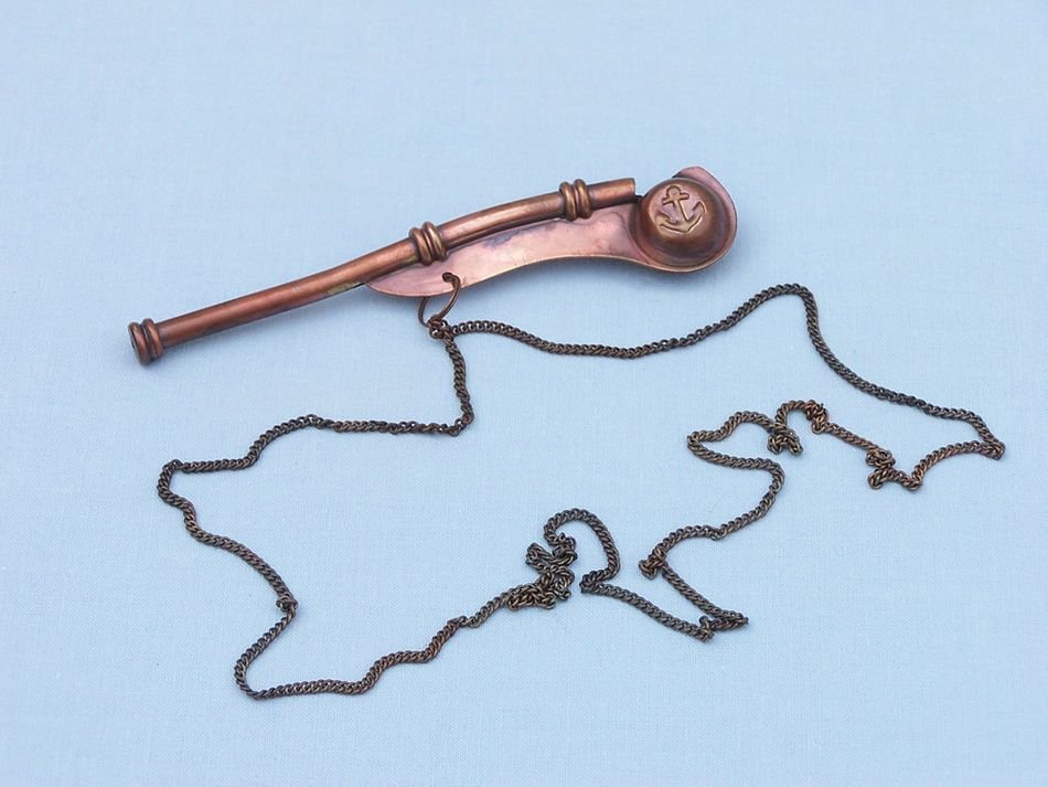 The Hampton Nautical Boatswain's Pipe (pronounced "bosun's") is one of the oldest and most distinctive pieces of nautical equipment. The boatswain's pipe, whistle, or flute, was used in Greece and Rome to keep the stroke of galley slaves. This beautifully detailed antique copper Navy Boatswain's Pipe comes with a quality 39 inch antique copper chain lanyard. With a traditional anchor design inlaid on both sides, this fully functional boatswain's pipe measures 5 inches (12.7 cm) long, and weighs at 1.6 ounces (45 grams) including the chain.