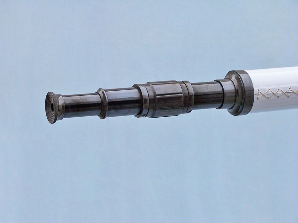 The Hampton Nautical Oil Rubbed Bronze/ White Leather Galileo Telescope 65" is by far our standout choice amongst nautical enthusiasts worldwide. Constructed from 100% oil-rubbed bronze, refractor telescope mounted on a wooden tripod. This telescope is a fully functioning nautical masterpiece that adds class and sophistication to any room it’s in. This is a perfect gift for the nautical explorer, an appropriate piece to spruce up an office for the busy executive, or perfectly position this exquisite telescope by your window sill to stargaze. The main scope is solid oil-rubbed bronze wrapped in white leather, which shines beautifully when placed in the sunlight. Focusing is accomplished by adjusting the eyepiece ring on the telescope tube, with up to 15x magnification. A removable bronze cap, connected by a chain, protects the objective lens.