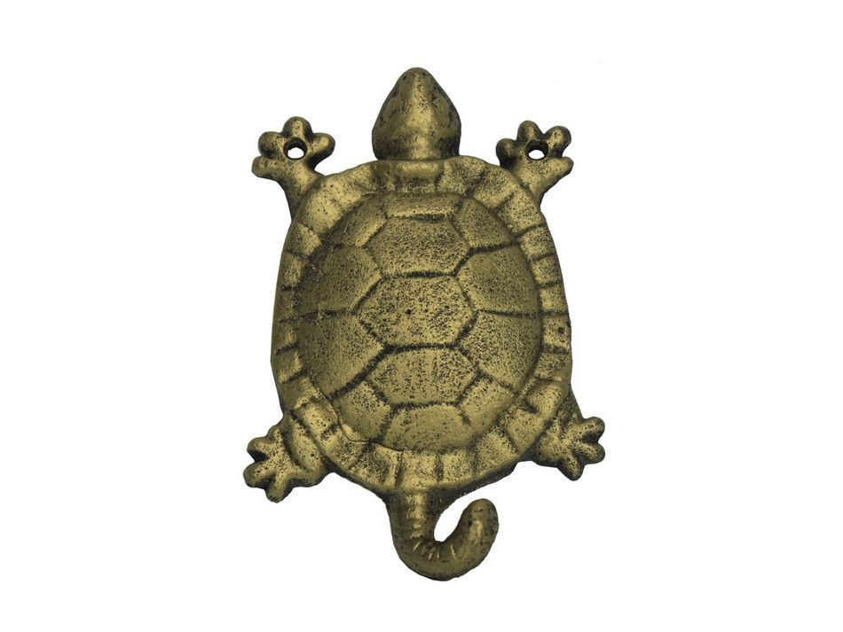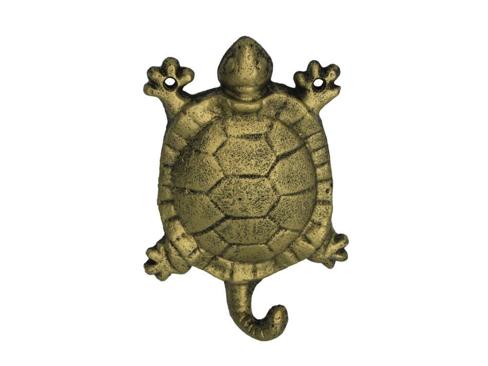 This Rustic Gold Cast Iron Turtle Key Hook 6" is the perfect addition for any nautical themed home. Handcrafted from cast iron, this gold hook allows for easy decorative mounting, ideal for hanging clothes and accessories. Display this decorative hook to add a nautical theme to any room and show those who visit your home your affinity for the nautical sea-faring lifestyle.
