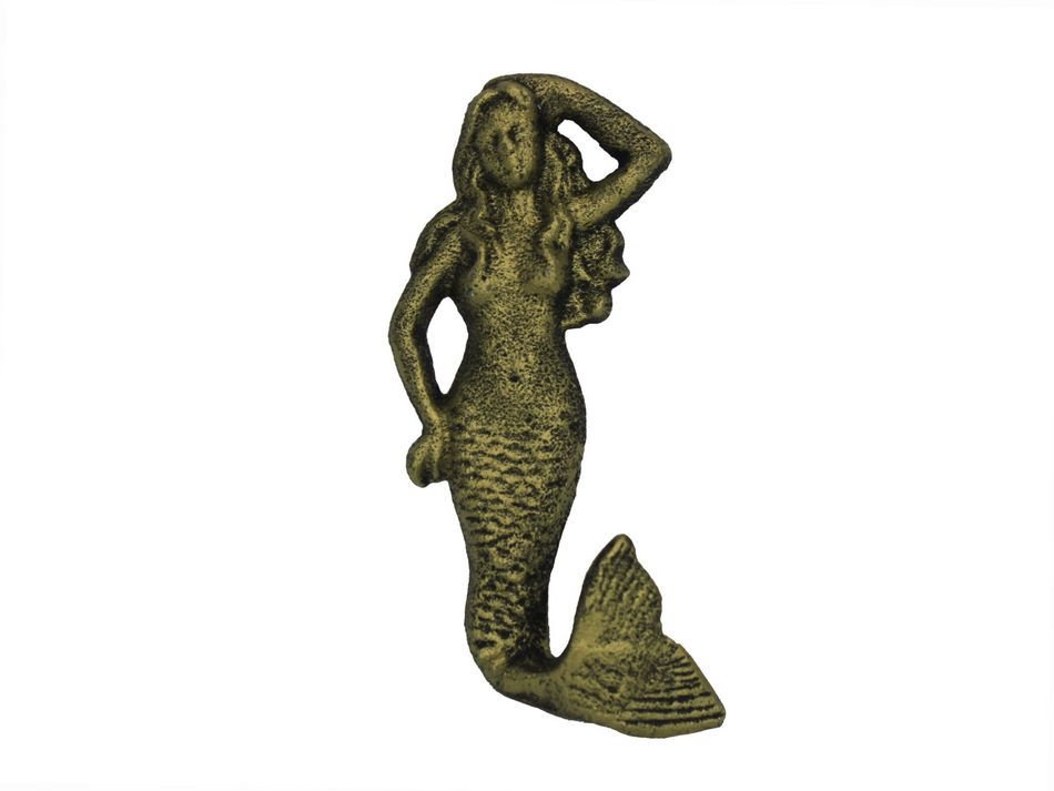 This Rustic Gold Cast Iron Mermaid Hook 6" is the perfect addition for any nautical themed home. Handcrafted from cast iron, this gold hook allows for easy decorative mounting, ideal for hanging clothes and accessories. Display this decorative hook to add a nautical theme to any room and show those who visit your home your affinity for the nautical sea-faring lifestyle.