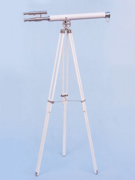 Beautifully crafted this Hampton Collection - Floor Standing Chrome - White Leather Griffith Astro Telescope 64” is our top of the line fully functional floor standing telescope. This nautical masterpiece is aesthetically pleasing and belongs in a nautical themed house positioned by an open window.  Mounted on a sturdy wooden tripod, this refractor telescope is the perfect nautical gift for an executive.