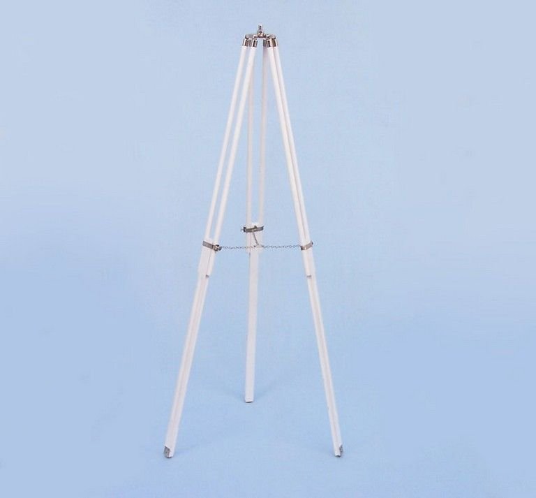 The wooden tripod white painted stand features smooth, polished round legs, each with solid chrome fittings and a screw release to let you adjust the height. A solid chrome chain holds the three wooden legs together so the telescope can maintain its position.