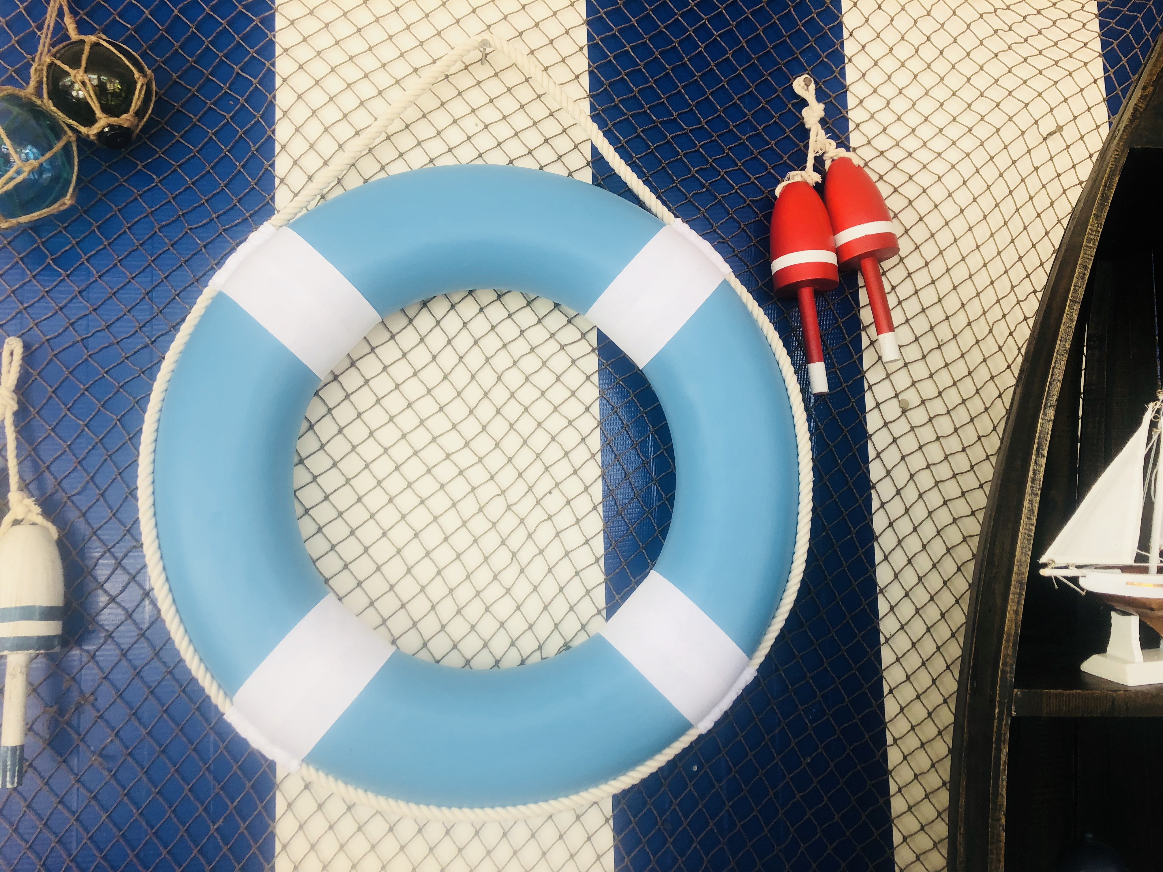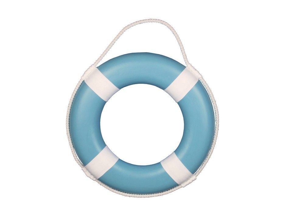 Our Light Blue Painted Lifering with White Bands 15" is the ideal piece to create that soothing ocean mood in any home or office. This bold solid colored lifering, compliments the white band around the lifering. Transform any room into a seaworthy experience without the water. Give as a nautical gift or hanging prominently on your wall to let guests know that you have an affinity for beach decor.