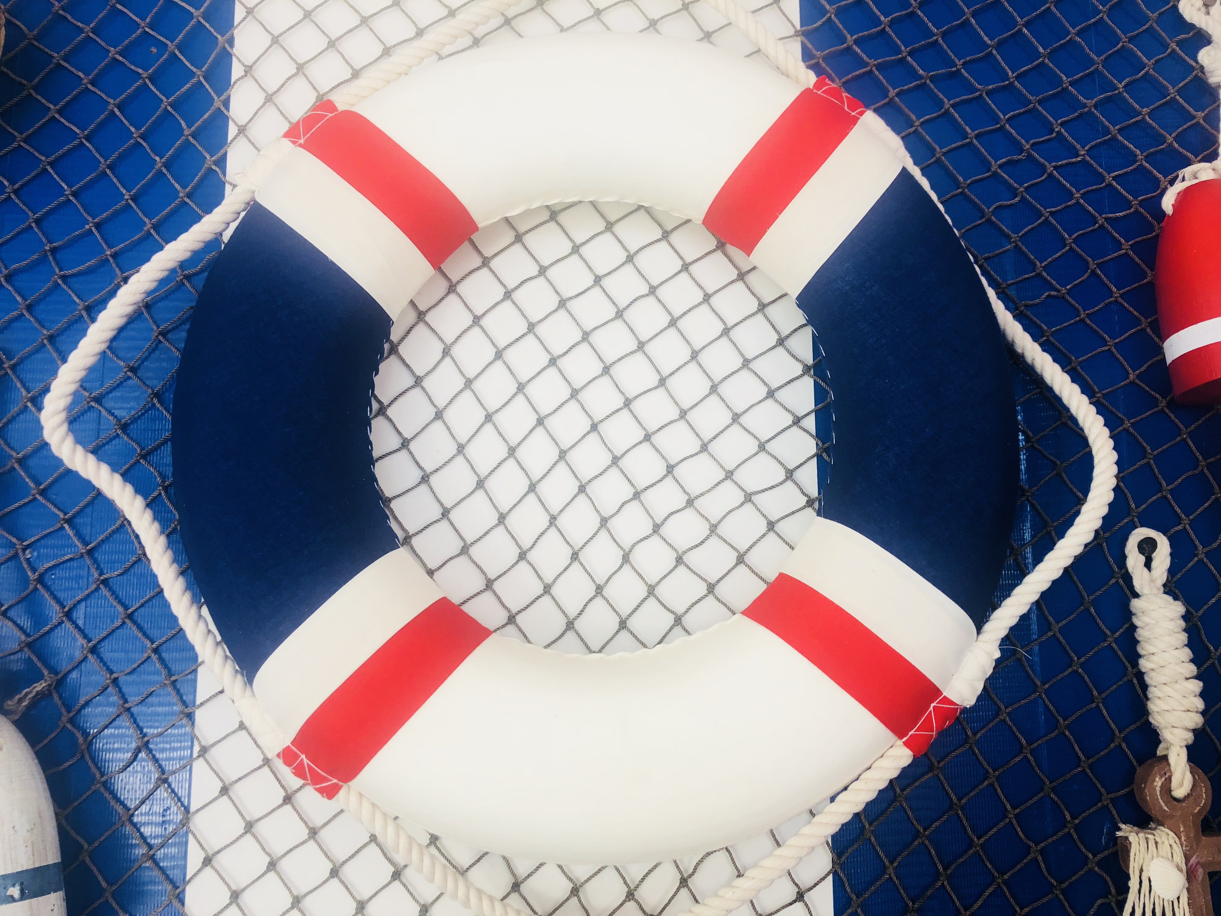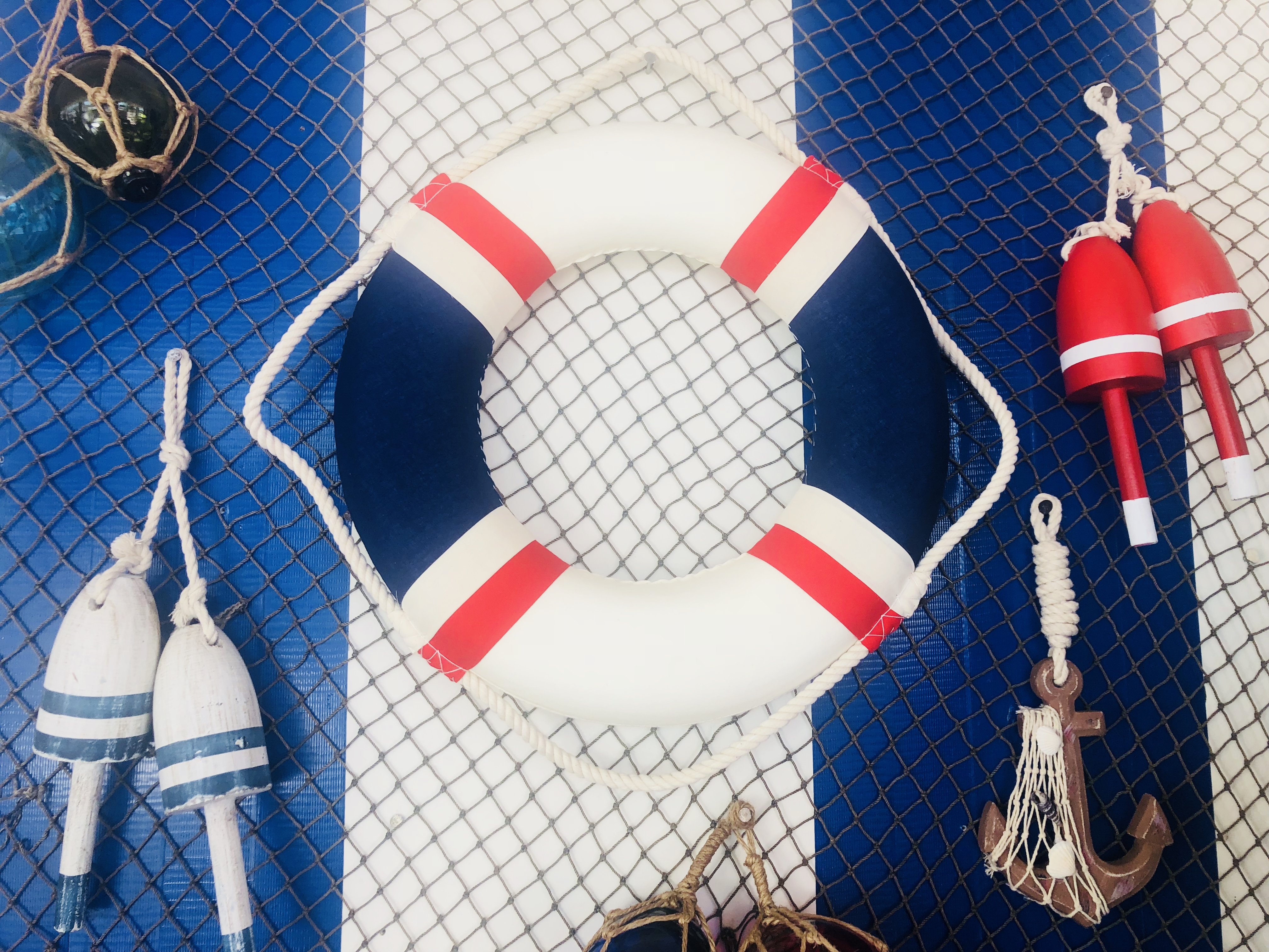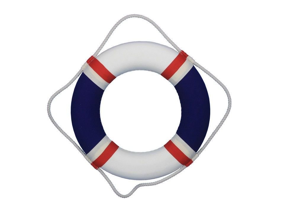 • Prominent white rope and red bands contrast the dark blue and white finish of the life preserver decoration