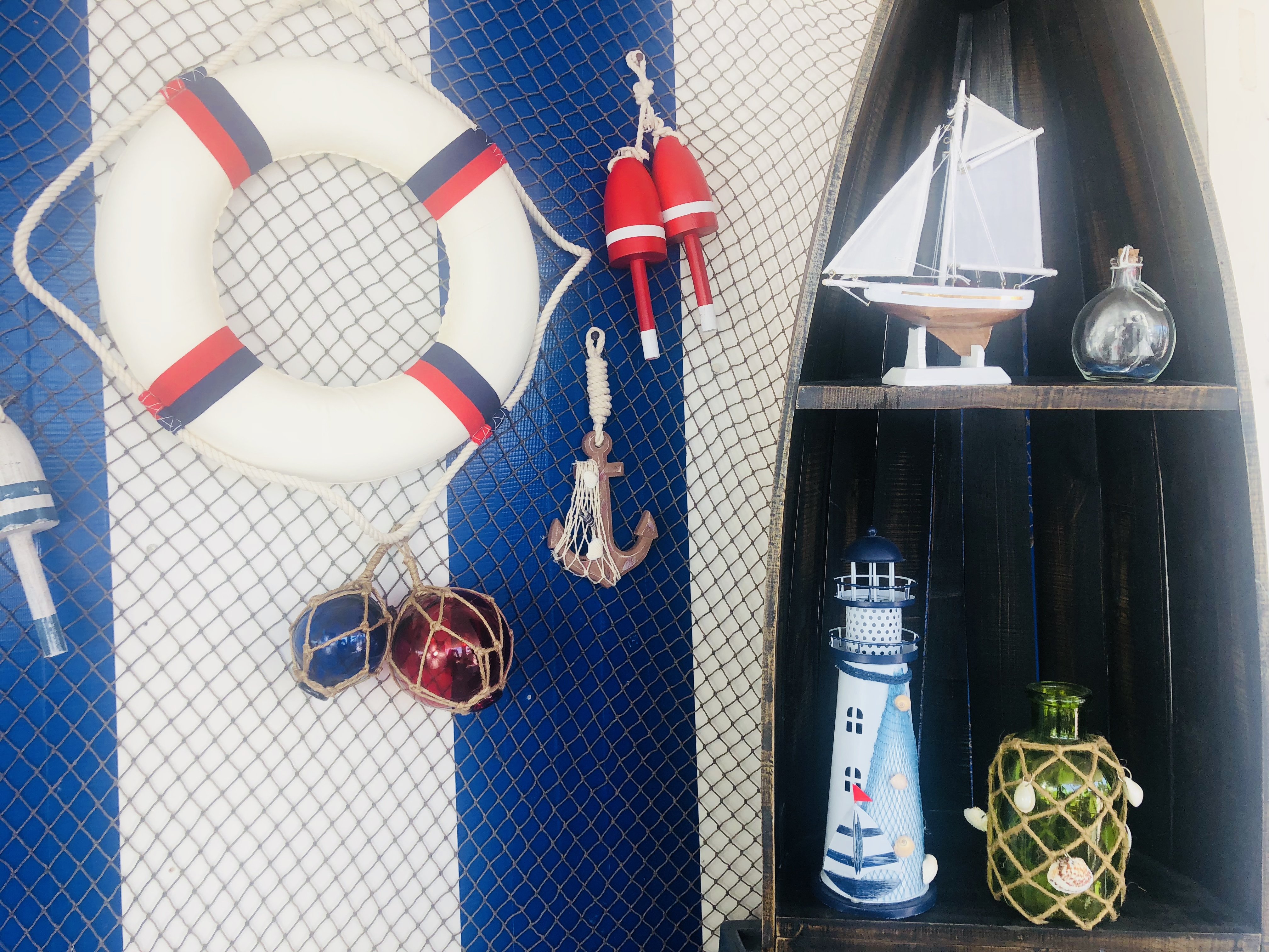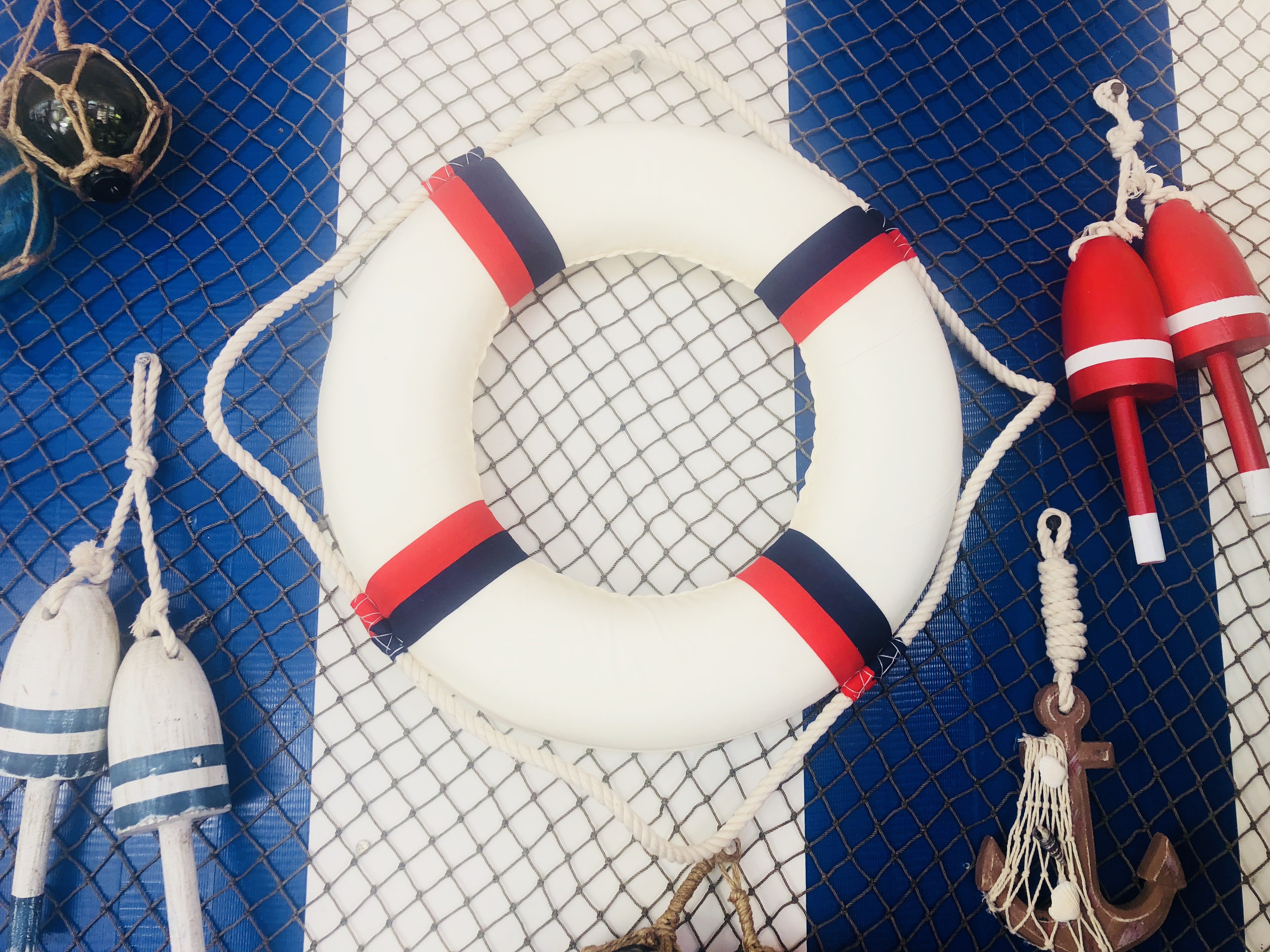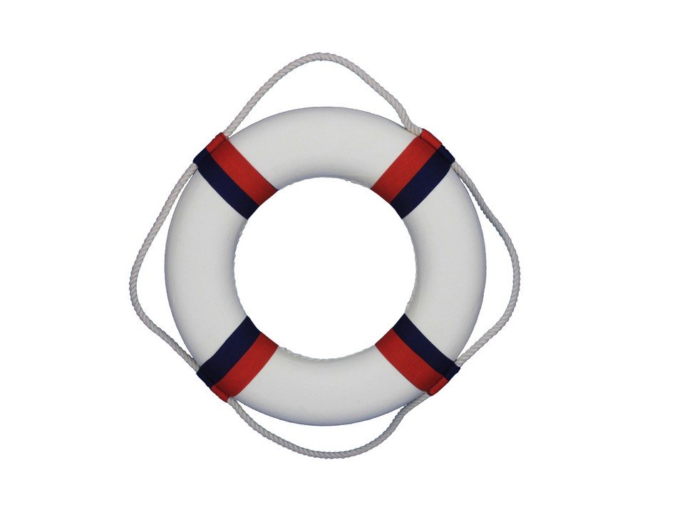 • Prominent white rope and red and blue bands contrast the white finish of the life preserver decoration