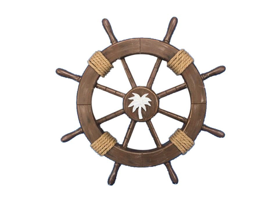This Rustic Wood Finish Ship Wheel with Palm Tree 18" combines a vintage finish with a delightful palm tree decoration to create a timeless piece of nautical wall art. Using a bold nautical wood and white finish, we have further accented the vintage ship wheel with rope.