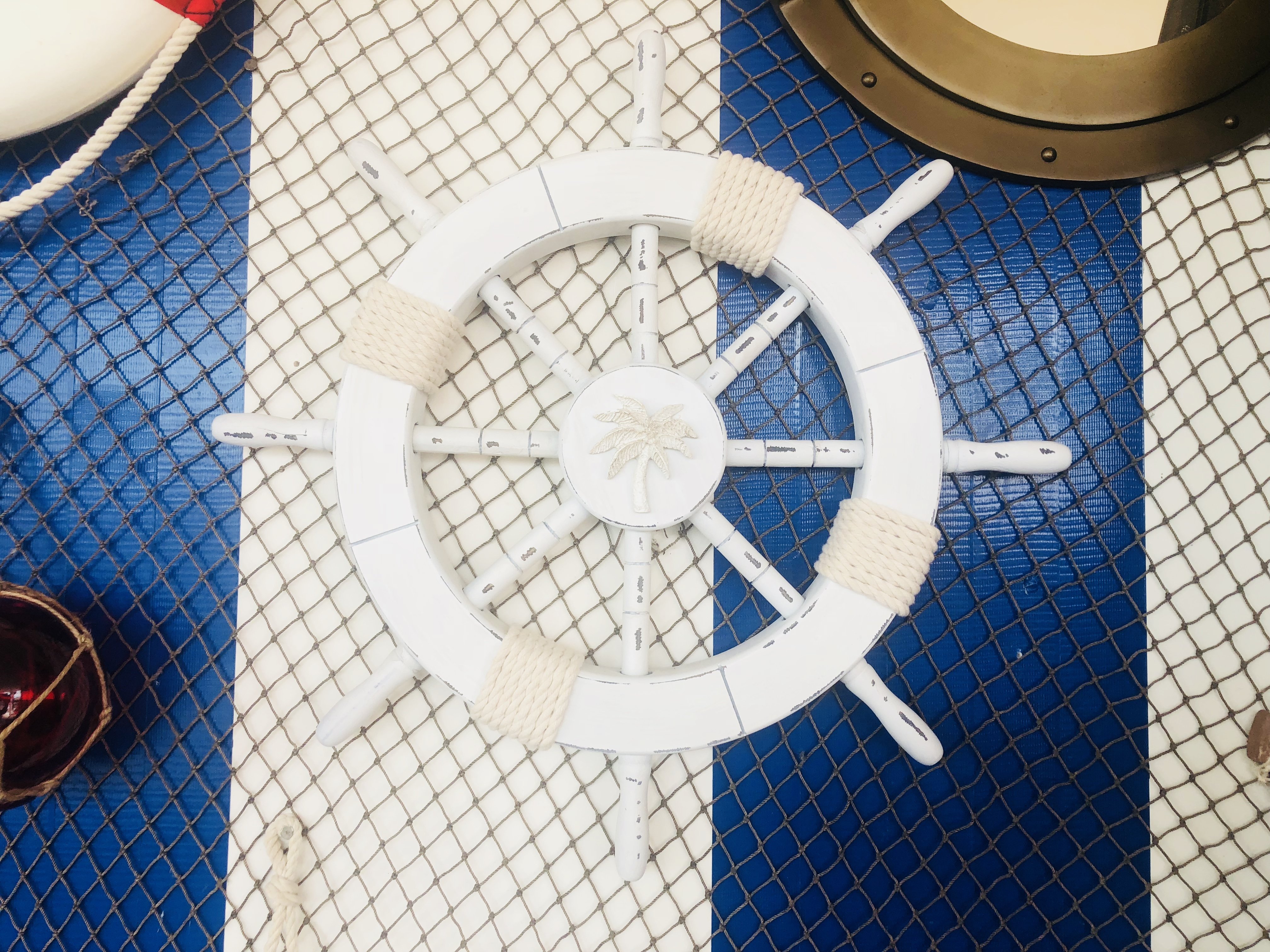 This Rustic White Ship Wheel with Palm Tree 18" combines a vintage finish with a delightful palm tree decoration to create a timeless piece of nautical wall art. Using traditional clean nautical whitewash finish, we have further accented the vintage ship wheel with rope.