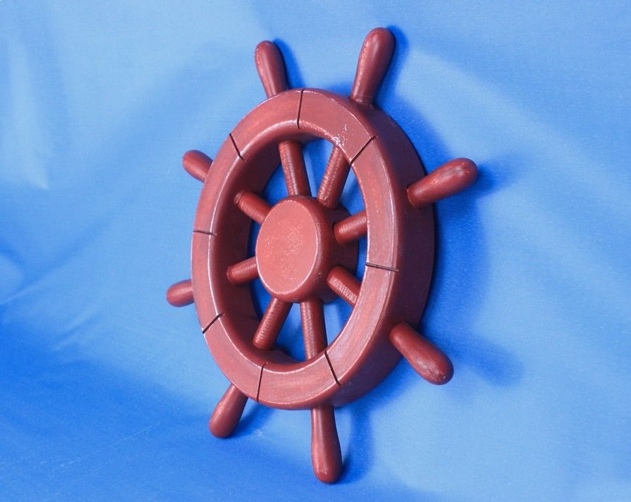 This Rustic All Red Ship Wheel with 12" combines a bold finish with quality craftsmanship to make this the perfect nautical wall hanging to accent your home. Ideal for those who love rustic and vintage nautical wall art, this beach decor will leave your guests in awe. This steering wheel has eight spokes surrounding it and is easily mountable to a wall in need of a beach decoration.
