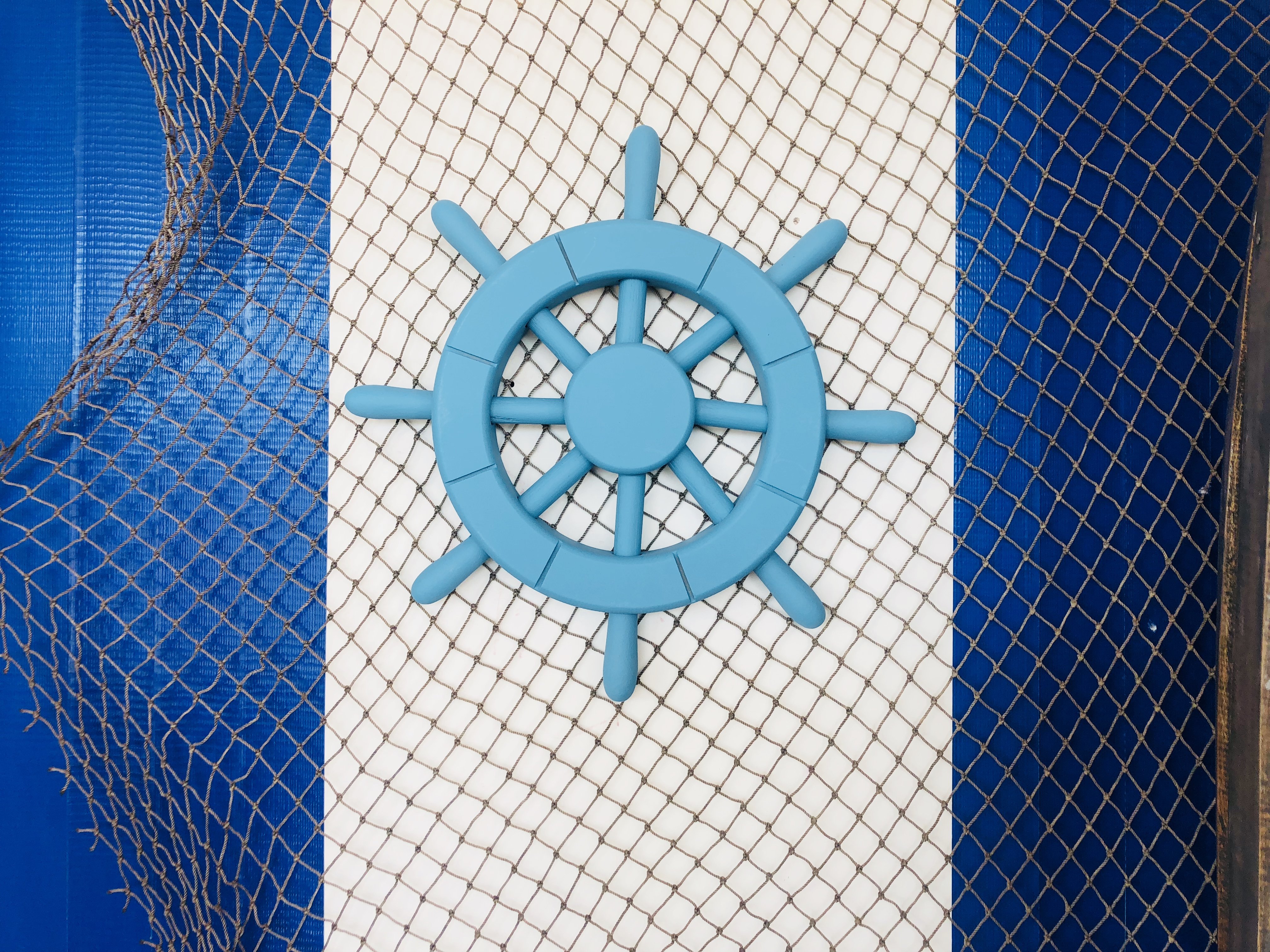 This Light Blue Ship Wheel 12" combines a bold finish with quality craftsmanship to make this the perfect nautical wall hanging to accent your home. Ideal for those who love vibrant nautical wall art, this beach decor will leave your guests in awe. This steering wheel has eight spokes and is easily mountable to a wall in need of a beach decoration.
