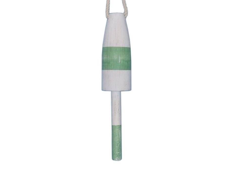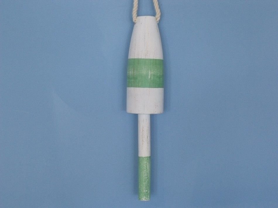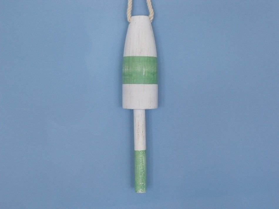 Classically themed and delightfully decorative, our Wooden Vintage Light Green Cape Rock Lobster Trap Buoy 15" is the perfect addition for your beach themed room. This whitewash and light green wooden float hangs easily from your wall to accent your home or collection. Traditionally lobstermen would hand paint their own unique buoy to distinguish theirs amongst the many lobster trap buoys at sea. In upholding the spirit of the lobster buoy tradition, we offer a new or rustic finish, sizes of 7”, 8”, 15” and 20” and finally a range of colors such as:  dark blue, orange, red, dark red, green, dark green, light blue, and yellow.