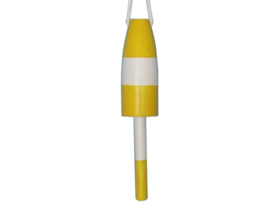 Classically themed and delightfully decorative, our Wooden Yellow Cape Rock Lobster Trap Buoy 15" is the perfect addition for your beach themed room. This yellow and white wood float hangs easily from your wall to accent your home or collection. Traditionally lobstermen would hand paint their own unique buoy to distinguish theirs amongst the many lobster trap buoys at sea. In upholding the spirit of the lobster buoy tradition, we offer a new or rustic finish, sizes of 7”, 8”, 15” and 20” and finally a range of colors such as:  dark blue, orange, red, dark red, green, dark green, light blue, and yellow.