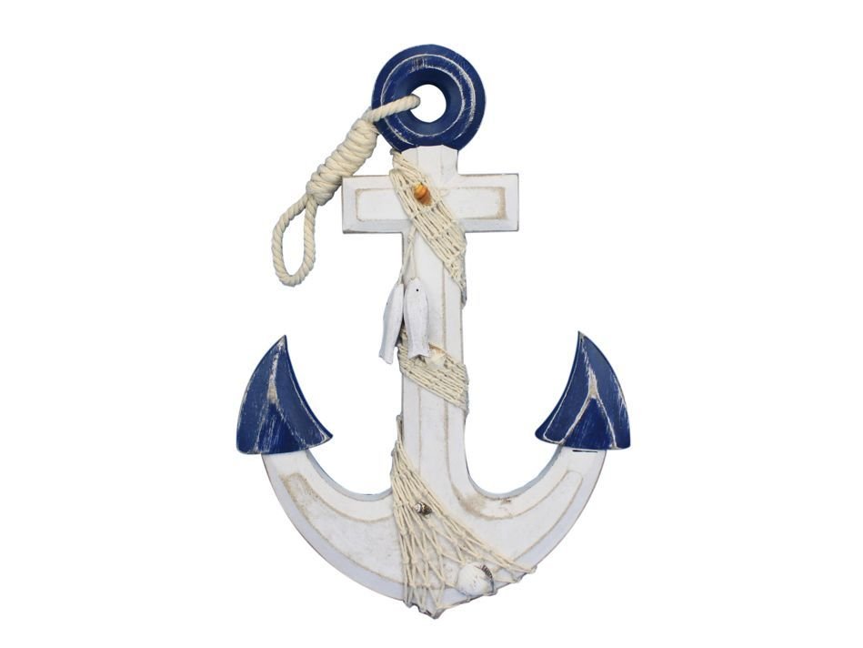 An icon of sailing past and present, the nautical anchor is both a necessary piece of equipment aboard ship as well as a talisman of good luck for all sailors who step aboard. This delightful Wooden Rustic Blue/White Anchor w/ Hook Rope and Shells 13" carries with it that same enchanting feel, bringing the wonder and magic of the sea into your home or office. No matter where you choose to place one of these fabulous anchors, enjoy its chic nautical style, historic significance, and symbolic wonder each and every day.