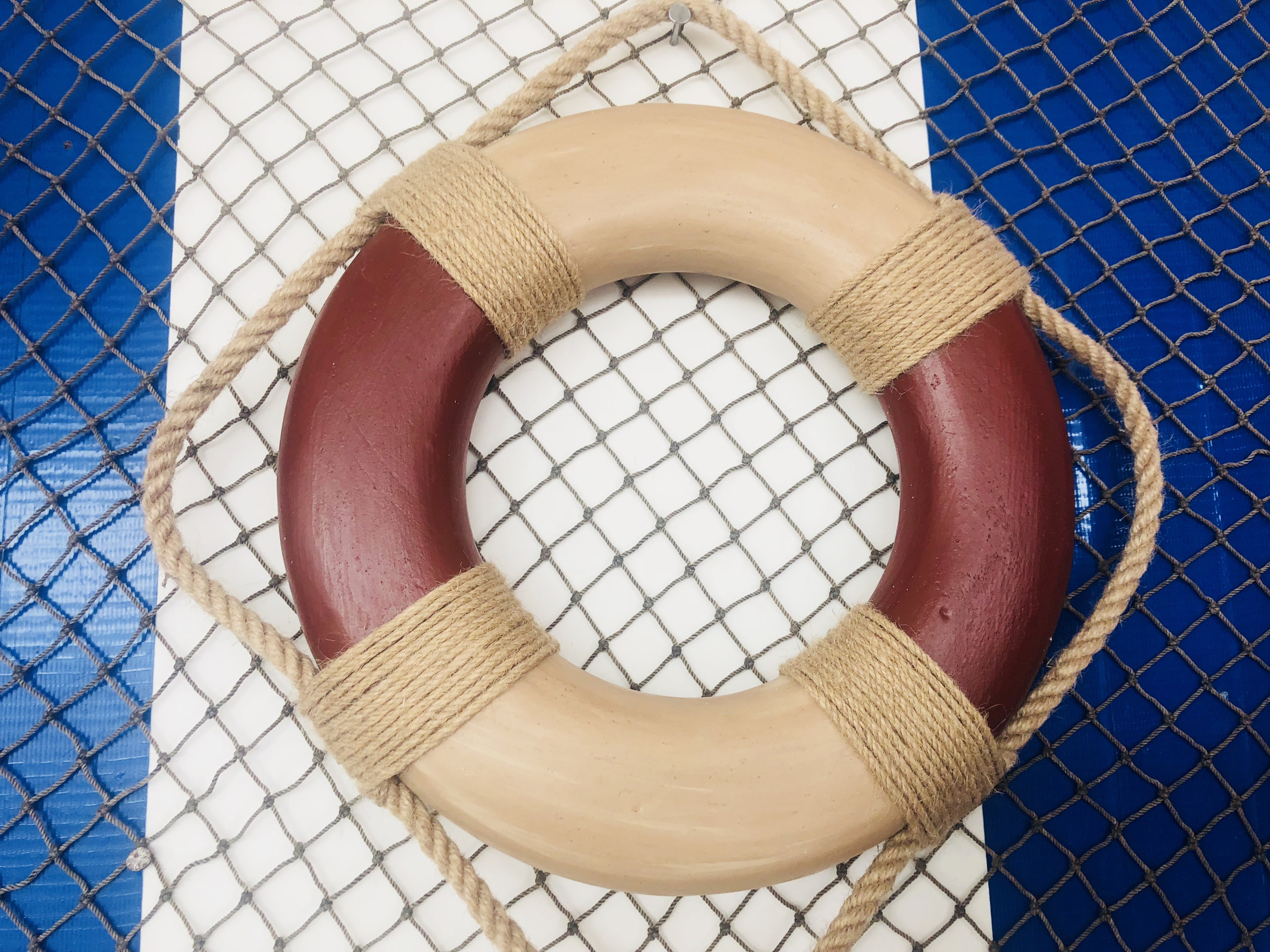 • Weathered rope is wrapped around vintage life ring