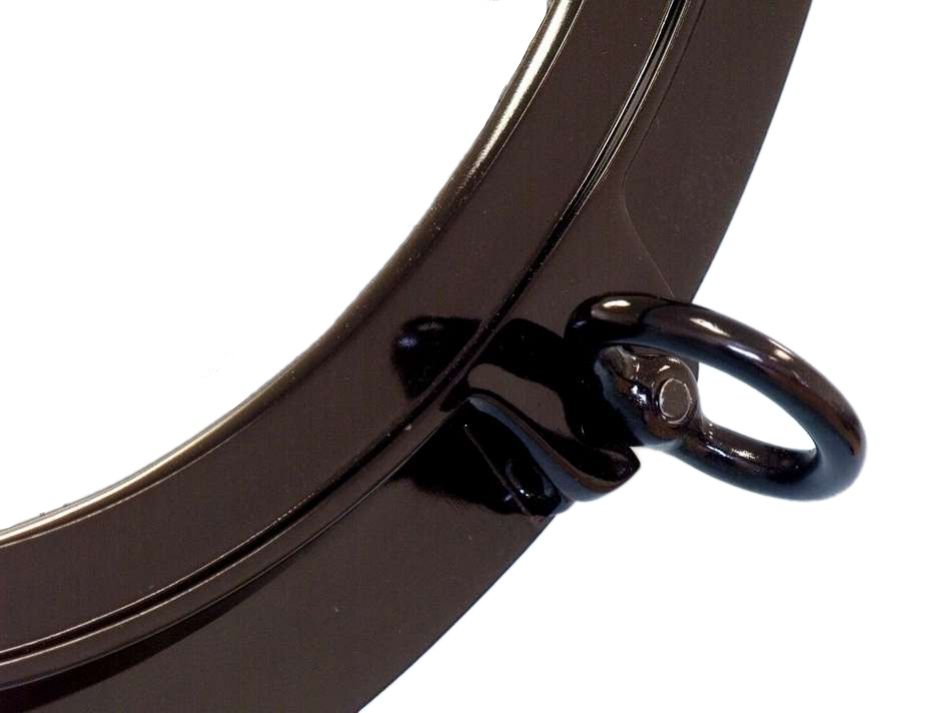 This Gloss Black Porthole Window 24" adds sophistication, style, and charm for those looking to enhance rooms with a nautical theme. This boat porthole has a sturdy, heavy and authentic appearance, yet it is made of wood and fiberglass to lower the weight for use as nautical wall decor. This porthole window makes a fabulous style statement in any room with its classic round frame, five solid rivets and two dog ears surround the perimeter of the porthole frame.