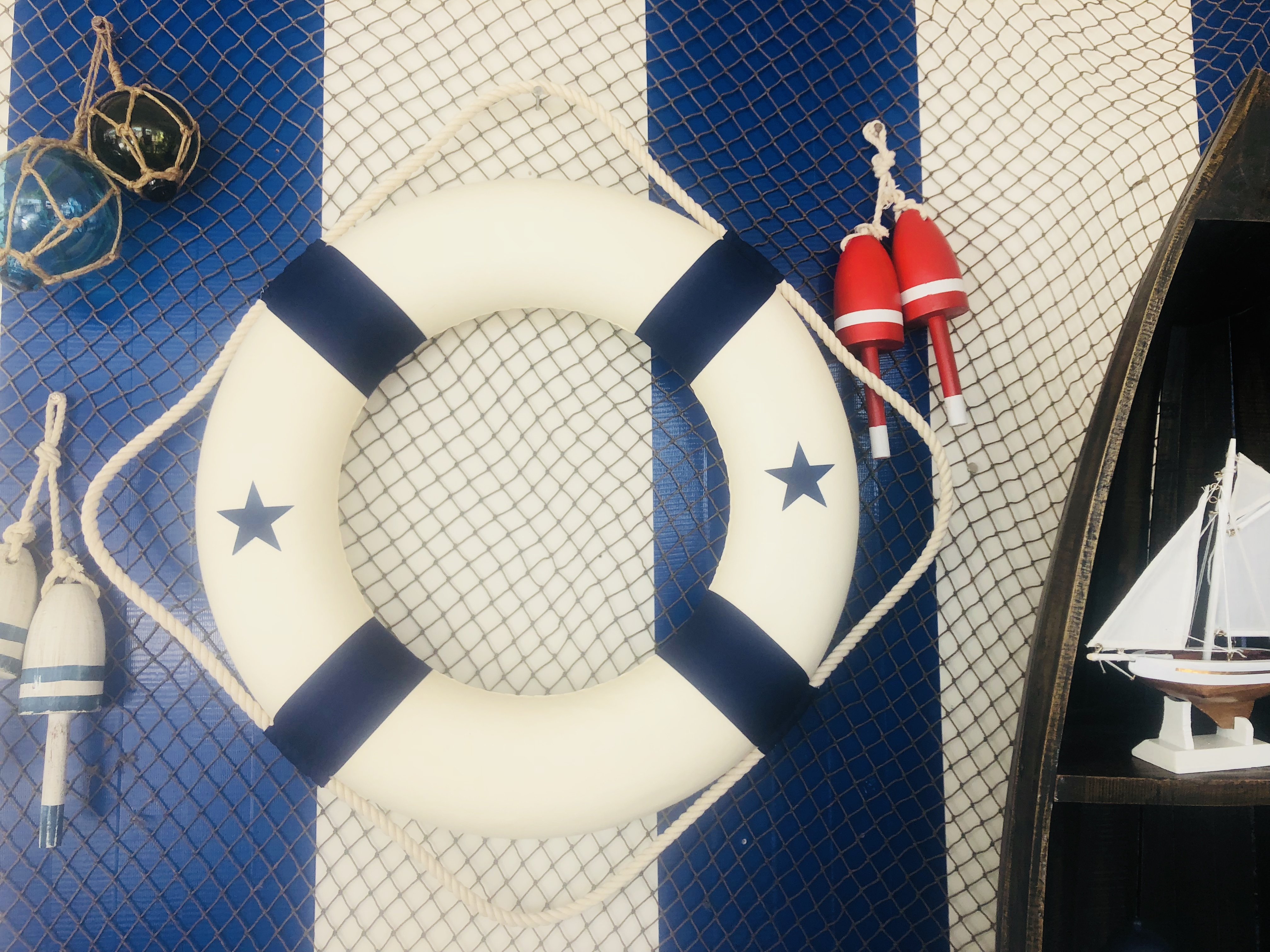 The Blue and White new 20" decorative lifering is the perfect nautical accent to add to your home, office, or pool area. Blue canvas straps accent the white lifering displaying nautical stars in blue, and will make guests and family feel at home and comfortable. Lightweight styrofoam construction makes the medium 20" lifering easy to hang anywhere so you can bring that nautical ocean feel into the comfort of your own home, office, nautical clubhouse, or poolhouse.