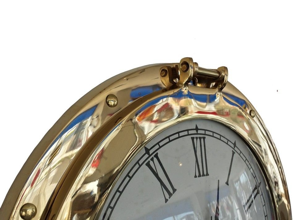 The Brass Deluxe Class Porthole Clock 15" is a classy and quality accent piece to add to any nautical themed room. This charming nautical port hole clock is both functional and stylish. Constructed from solid brass this beautifully polished finish will accent your nautical wall decor perfectly.  In addition, this Brass Deluxe Class porthole clock opens just as if it were on a ship of the time.  Batteries not included.