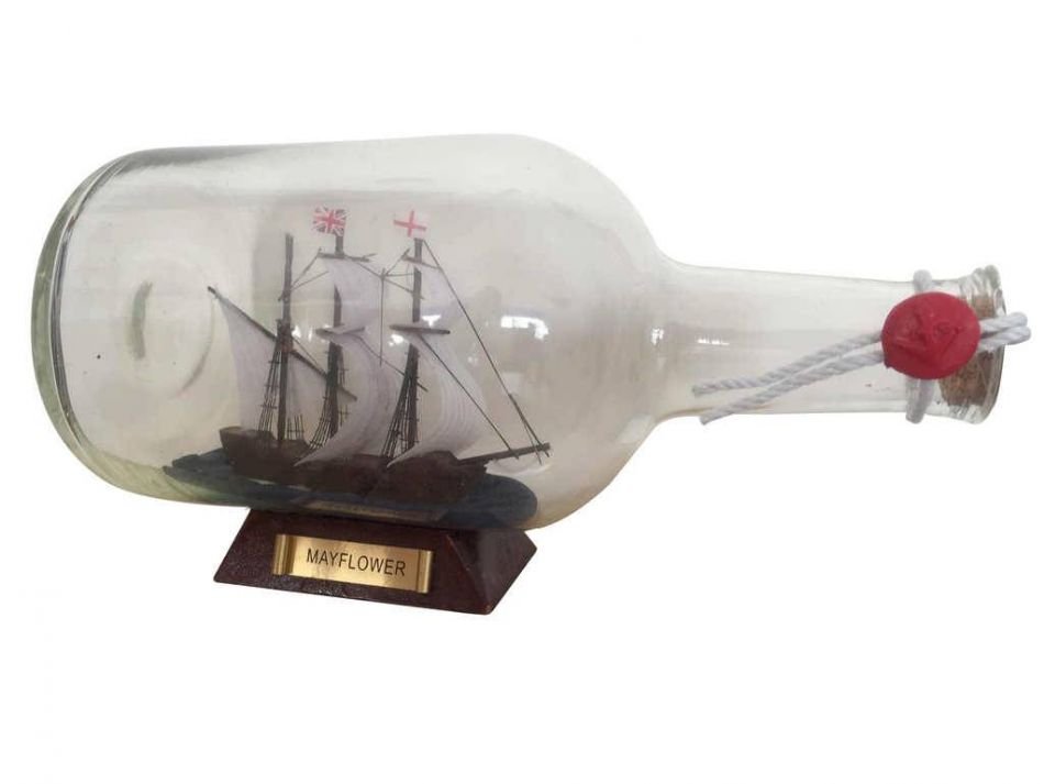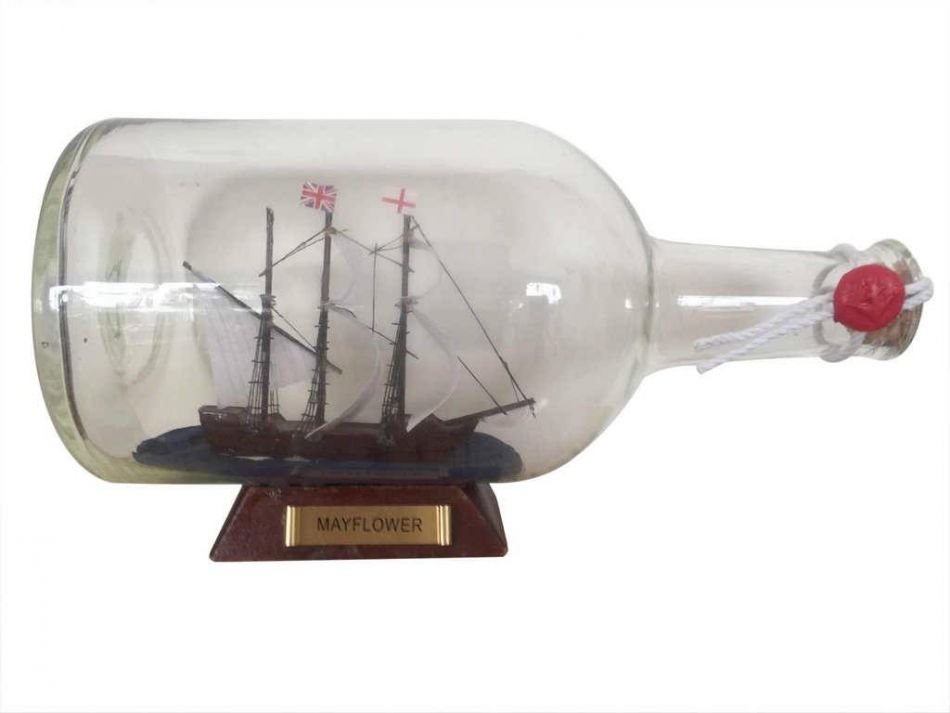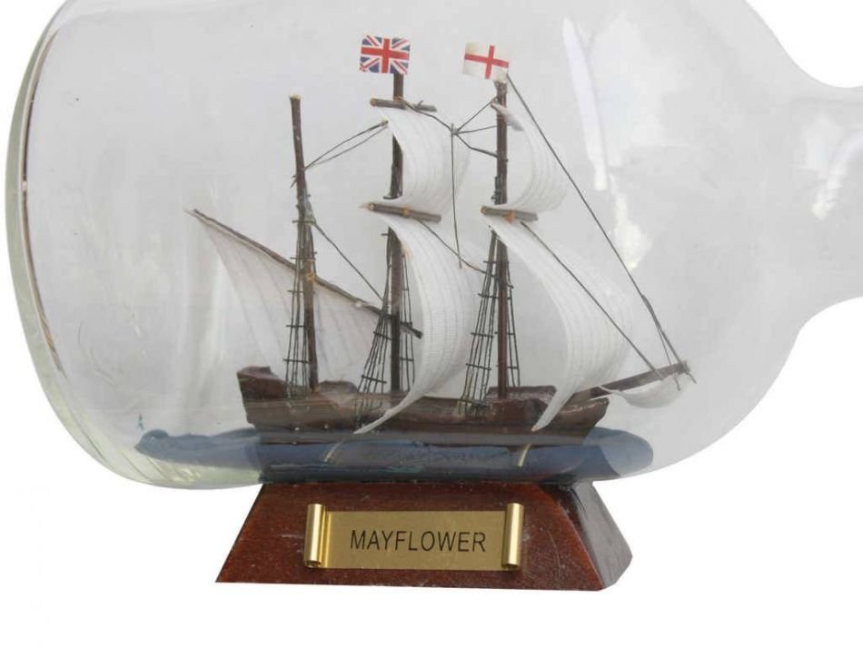 - Metal nameplate on wooden base identifies the ship as the Mayflower