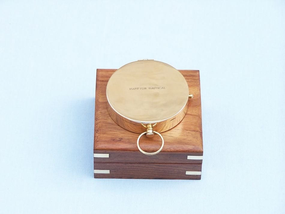 This solid brass compass comes with a rosewood box that has the Hampton Nautical anchor with rope logo embedded into the top. The box is a smooth and polished finish wood with a green felt on the inside to protect the compass.