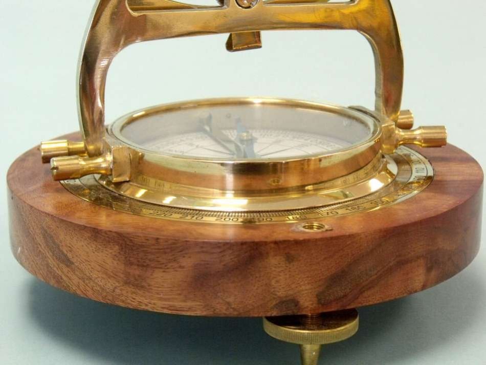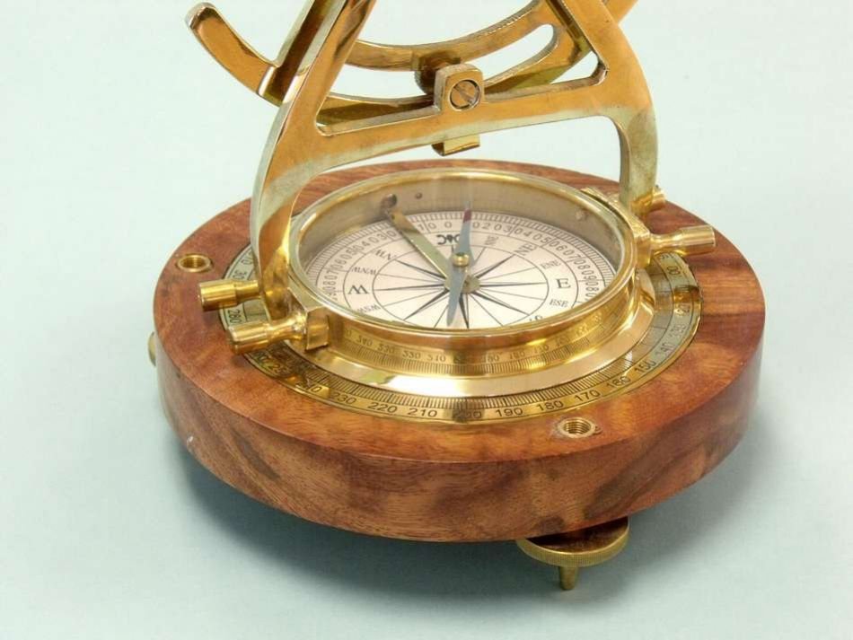 The Hampton Nautical Brass Alidade Compass with telescope and bubble level is a beautiful desktop nautical gem or can rest perfectly on a mantel or bookshelf. This solid brass alidade has a magnetic compass mounted beneath it for guaranteed accurate readings. On the telescope is mounted a bubble level for precise sighting. Alidade is mounted on solid brass support with a complimenting hardwood base which has 3 adjustable leg-screws for perfect balance. Fine-quality reproduction for surveyors to align and measure vertical and horizontal angles. This solid brass nautical gem features a real working telescope.