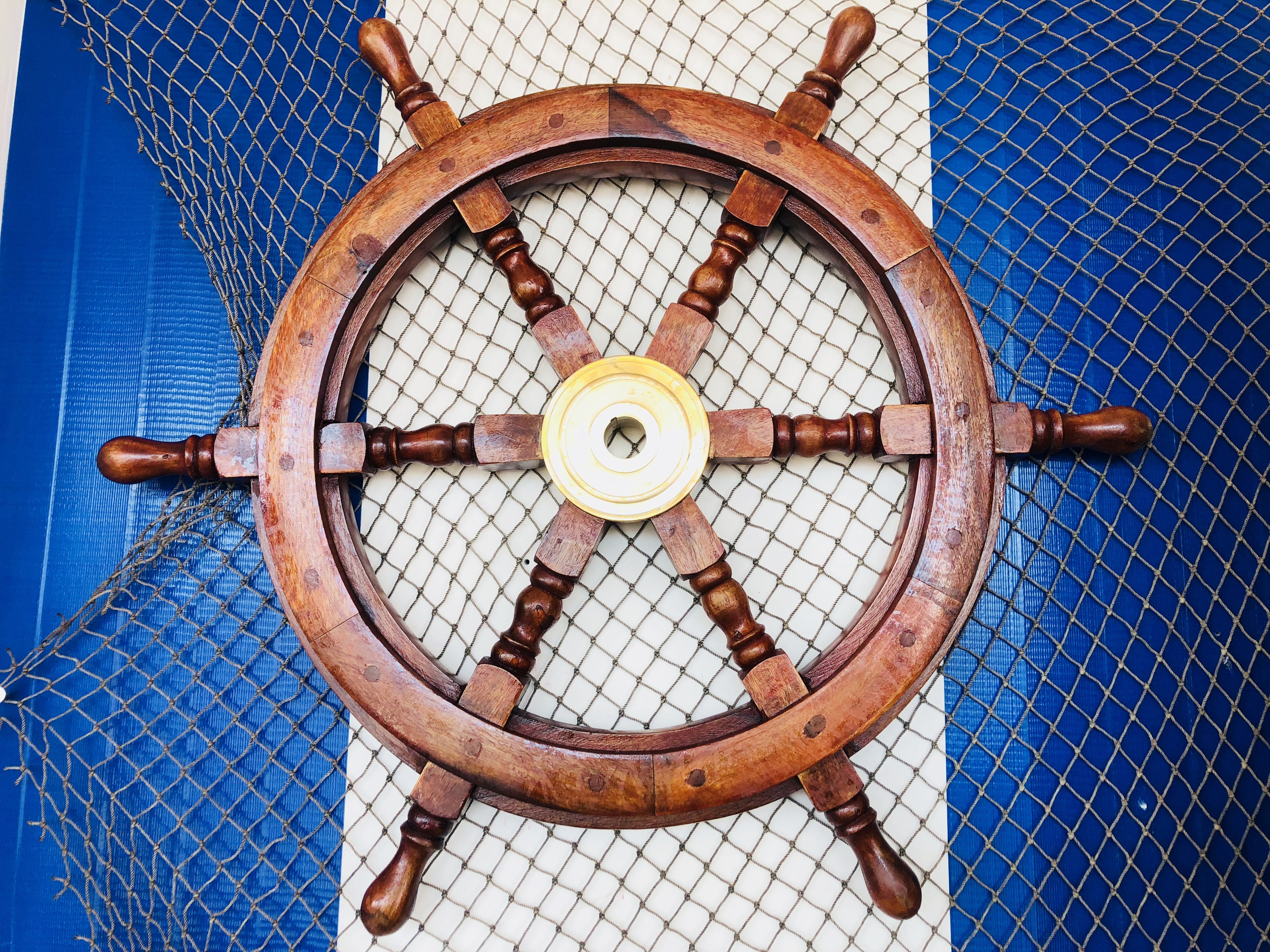 Made from rare, high quality Shisham wood which is hard, strong and is highly regarded for its ability to resist the elements.  The decorative wooden ship wheel has six spokes, each skillfully turned and assembled with plugged screw heads. The brass center hubs have uniform sizes holes and machined keyways.