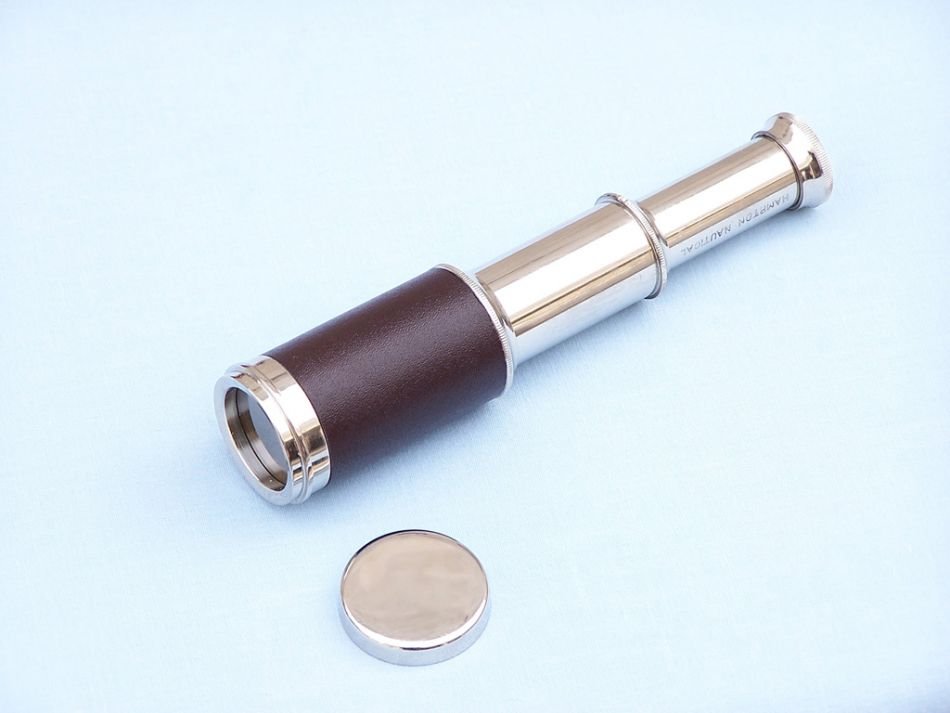 The Hampton Nautical 7” Brass Spyglass is a great gift for the young nautical explorer in your life. This small brass spyglass is pocket sized, at 3.5" when collapsed and 7" when fully expanded. The handle of this spyglass is a stitched dark brown leather. This spyglass also comes with a solid brass cap to protect the lens. Simply adjust the telescope tube length to bring the image into clear focus.