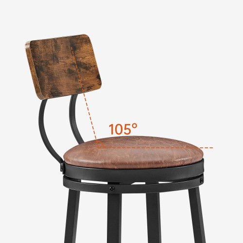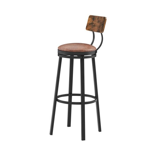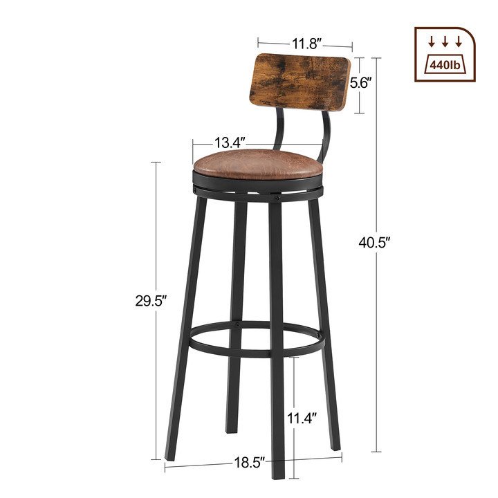 Swivel Bar Stool; High Bar Stool With Backrest; PU Soft Seat Cushion; Industrial; Thickened Iron Frame; Footrest.(Rustic Brown; 13.4''w x 40.5''h)Package Contents2 x Bar Stool1 x Assembly Kit1 x InstructionsProduct Description• The 1.8-inch thick padded seat is comfortable to sit on; and can also rotate 360°; allowing you to sit on the bar stool easily and turn around to chat with others; which is comfortable and convenient!•The curved backrest is ergonomically designed to fit your back. Thickened steel support; the backrest is stable and will not shake.•The high-quality brown PU stool surface and black iron frame create a minimalist style.• The hoop at the bottom of the stool is placed at the correct height to support the foot.• Additional seating will be provided in kitchens; living rooms and family gatherings. It can even be used as industrial decoration.• Stool feet are padded to avoid scratching the floor.• Your bar stool is up to you; you can place it anywhere in your home for a drink with good friends or just relax with a drink by yourself.Product information•Product Type: swivel bar stool set•Color:Rustic Brown•Material: Particleboard; Iron; PU•Dimensions: 13.4''w x 40.5''h•Seat Height: 29.5''•Stool cushion height from the ground:29.5''•Backrest width:11.8''•Max. Static Load Capacity per Stool:440lb•Assembly Required: About 25 minutes•Ships in 1 package Notice•Indoor use only.•Colorways and measurements may vary slightly.•Consult all warning information and use caution when assembling. •Liquids should be immediately blotted with a damp cloth. •Avoid the use of chemicals and household cleaners as they may damage the finish.•Adjust locks and hardware as needed.•Please do not exceed its weight limit.