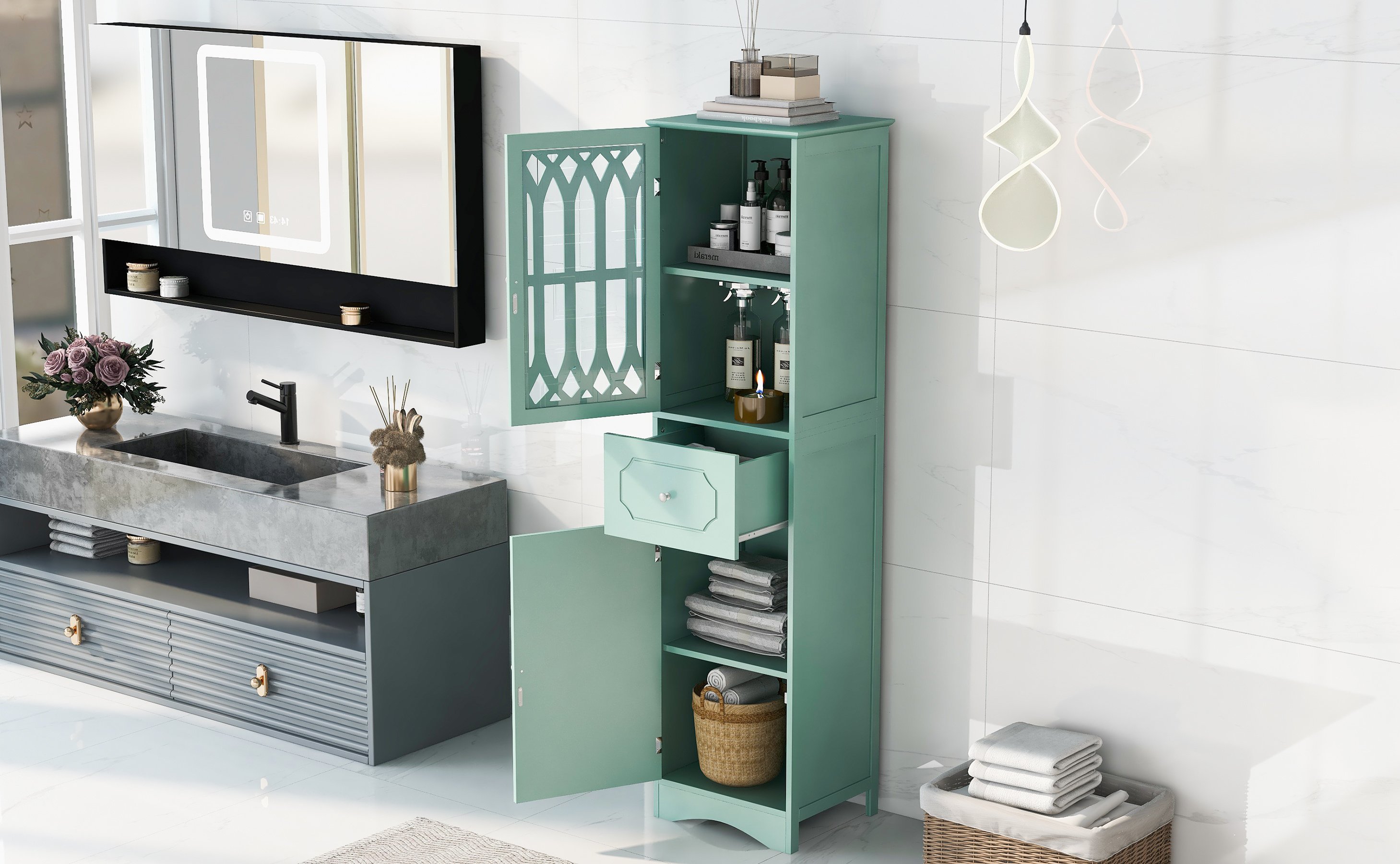 [Modern Design]: Featured with a sleek and classic look in light color, the top and bottom panel has a beautiful curve design, and the groove pattern on the drawer and door adds more elegant elements to satisfies the combination with your bathroom decoration style.