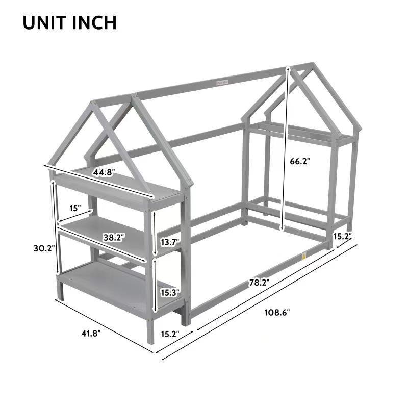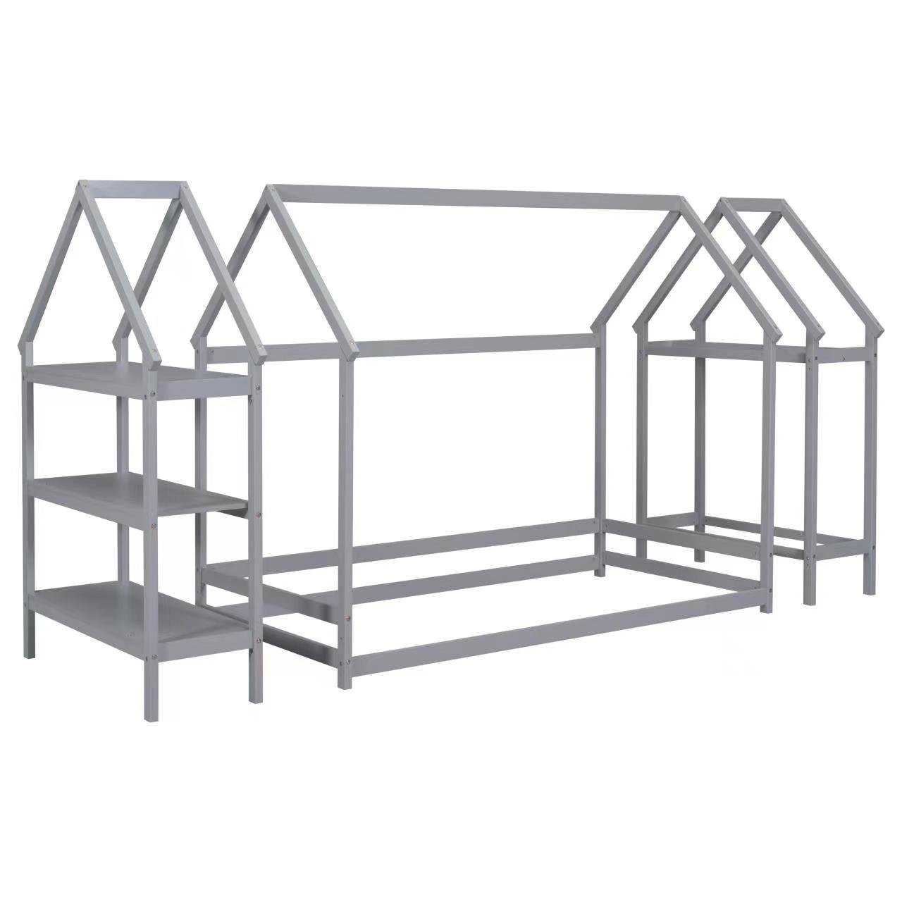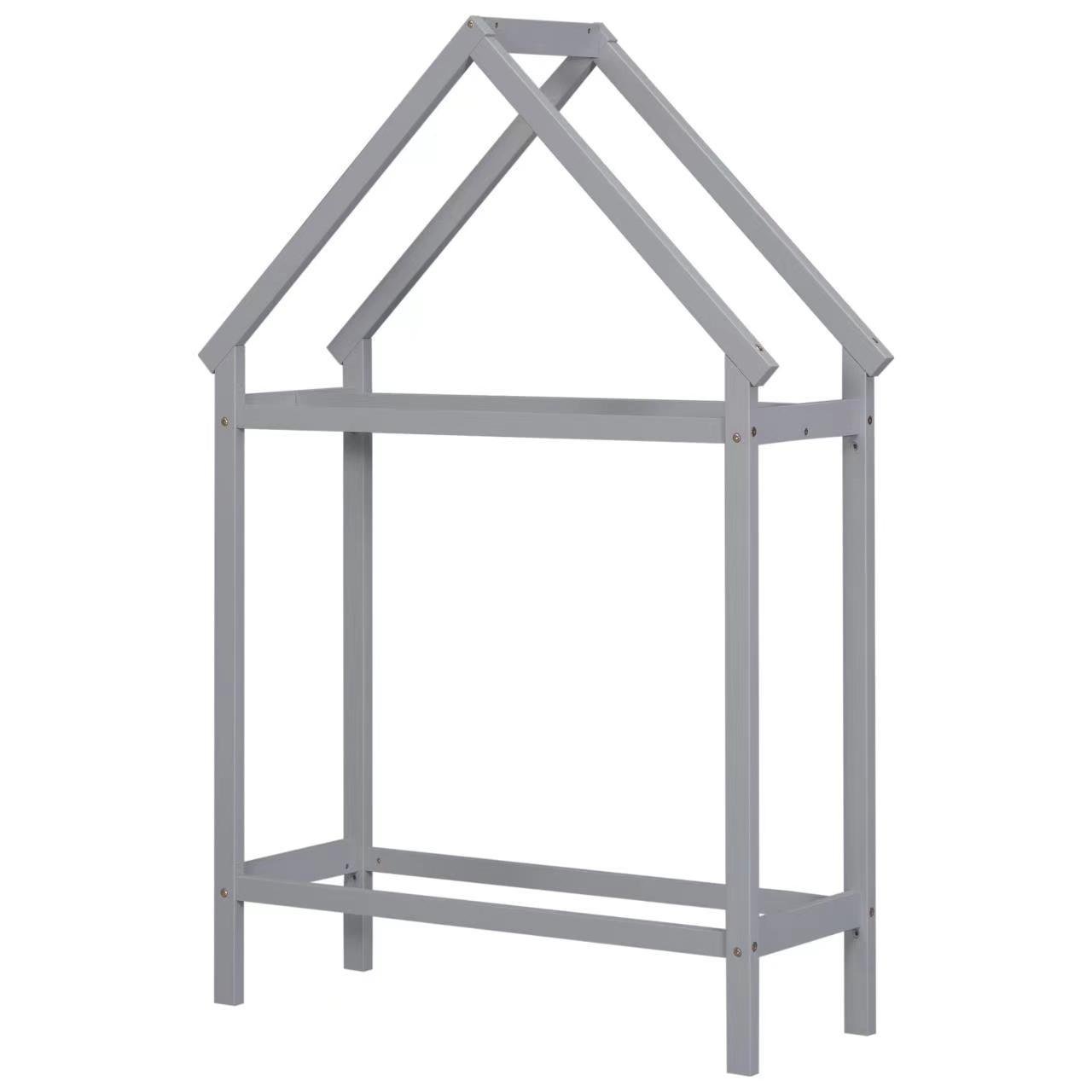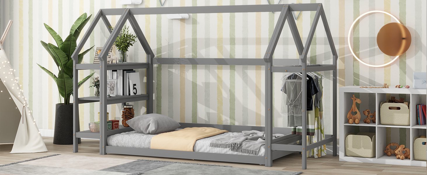 Discover the perfect blend of functionality, comfort, and style with our twin house-shaped bed with two stands. This twin floor bed with stands has a lovely, interesting house style, featuring a wooden house-shaped roof frame structure to meet the desire of exploring the world, decoration and imagination, and ithas two stands for storage, hanging clothes and decoration.